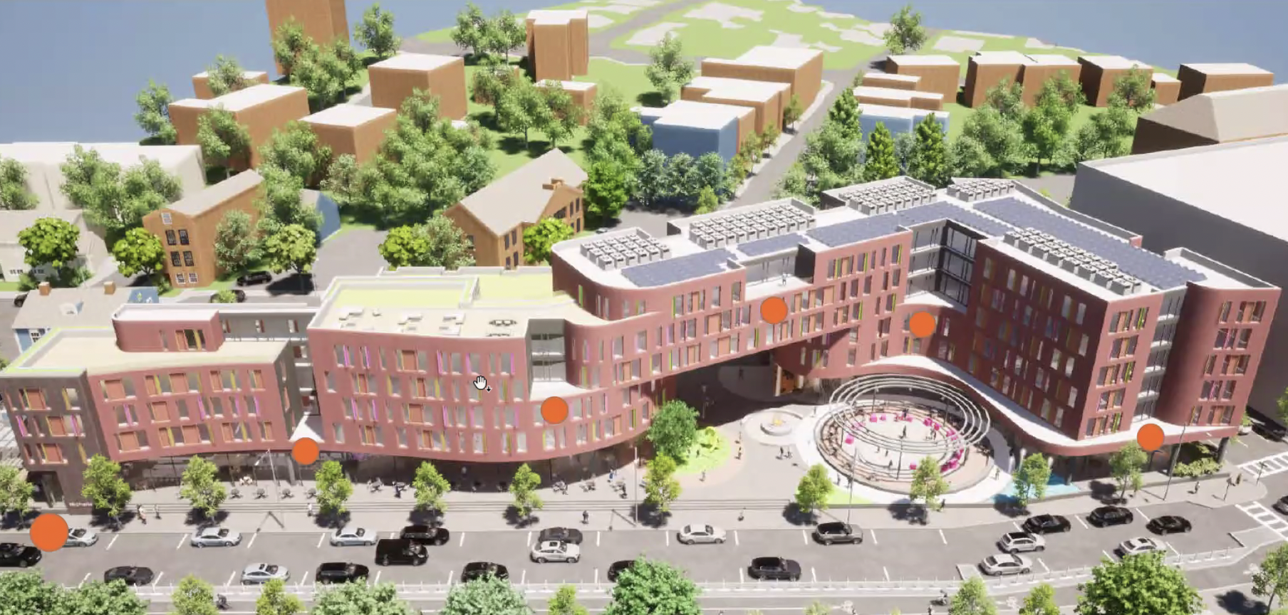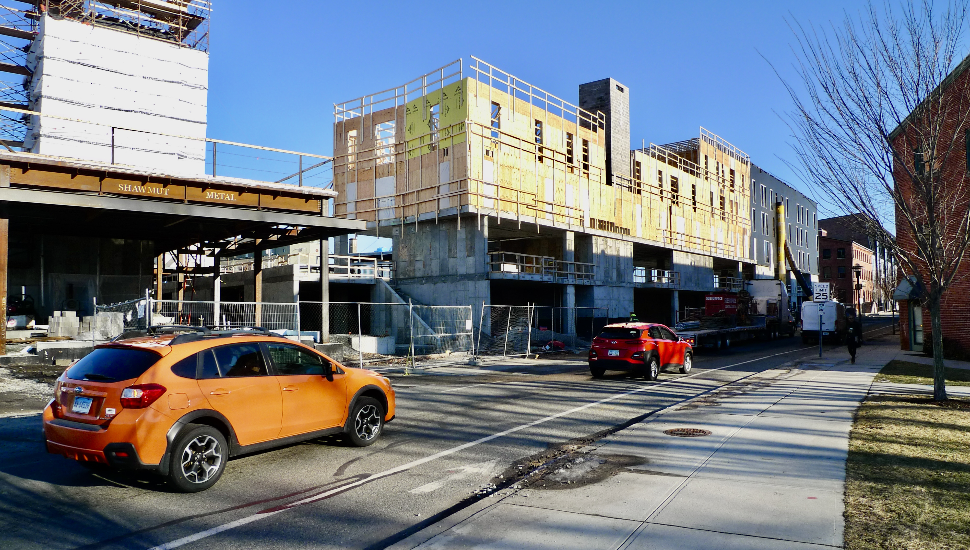 The Urbanica design is the best proposal of three–one senses that the Boston design firm has an architectural language beyond the typical developer schtick that the Commission has favored. Nevertheless, their apartment block needs considerable refining and some outright changes, so the final appearance is far from set. Concerns about the building’s bulkiness have already resulted in lowering the overall height; reducing the commercial space floor height from 13 to 8 feet will also mitigate the building mass. Ground-level passageways will flow through the building, and there is discussion about tweaking the brick and terra cotta wall coverings. Neighbors have asked the Commission for traffic and shadow studies.