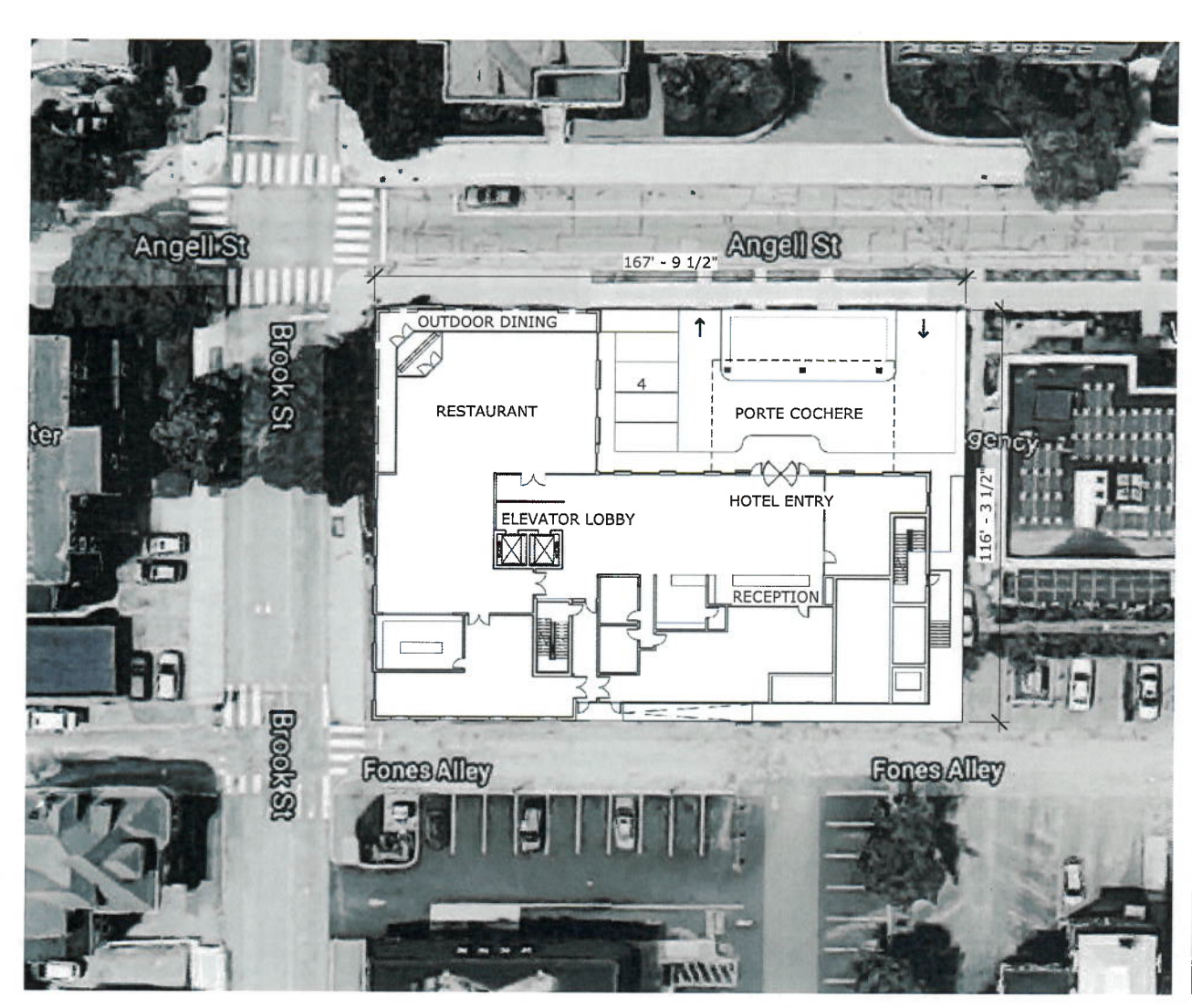 parking spaces are at grade accessed off Angell Street. Aesthetically the hotel design responds to the neighboring East Side character and will be clad in a cream-colored brick and light gray panel, accented with darker gray trim. A Porte Cochere anchors the entrance of the hotel and large expanses of glazing activates the space inside at both Brook and Angell streets."