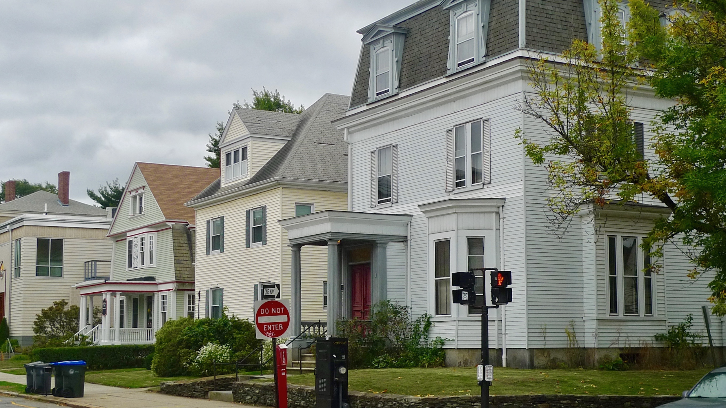 The large one on the corner is French Second Empire, the one in the middle is a Georgian Revival house, while the other is a well-preserved 1892 example of the Queen Anne style.