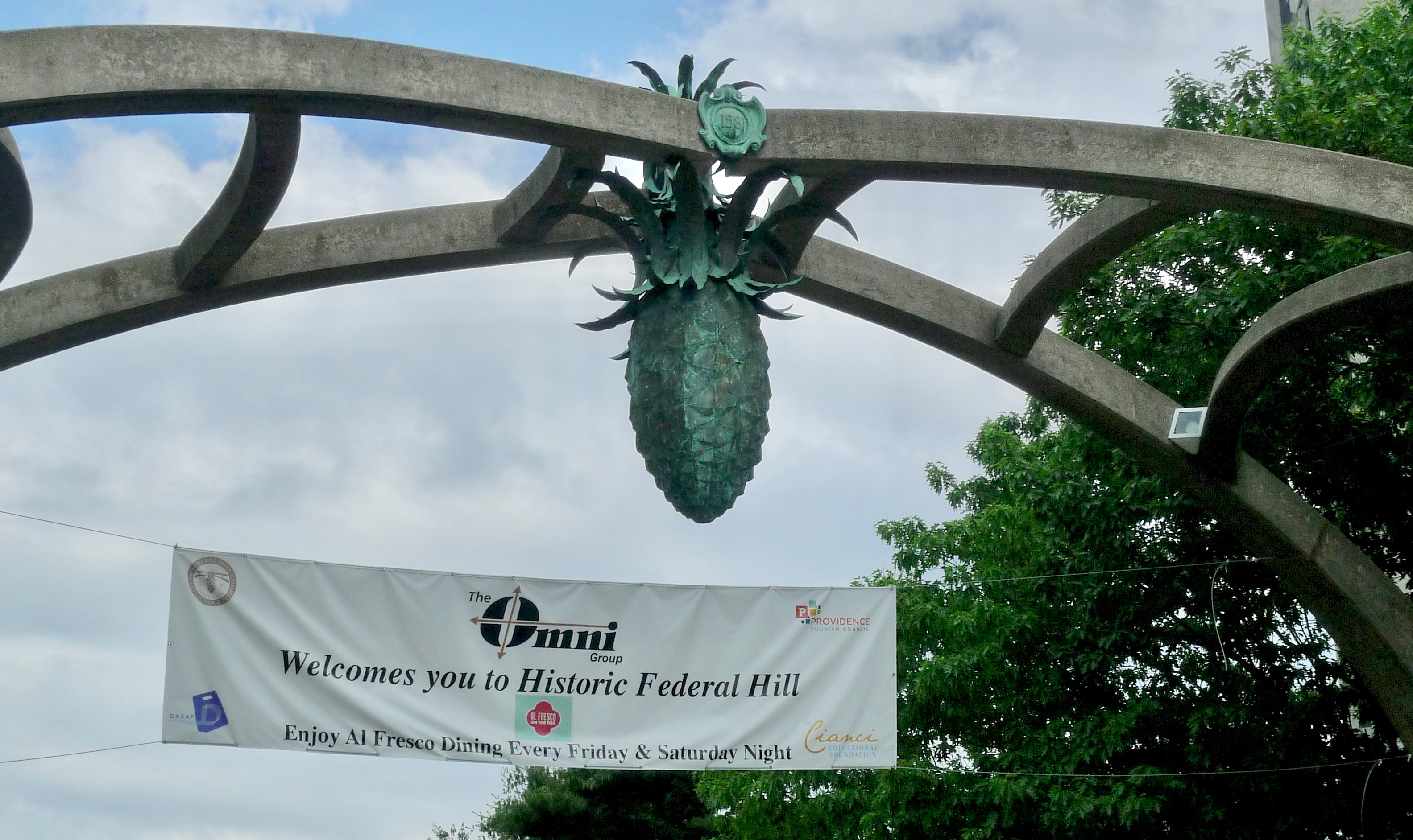 And the most prominent signifier of la vita Italiana is the so-called bronze pineapple suspended from the gateway arch at the eastern entrance to Federal Hill. Whether you care to think of this as a gesture of welcome or as Roman fertility symbol, "La Pigna" is partly obscured by a banner declaring that the Omni Group Welcomes You to Historic Federal Hill.