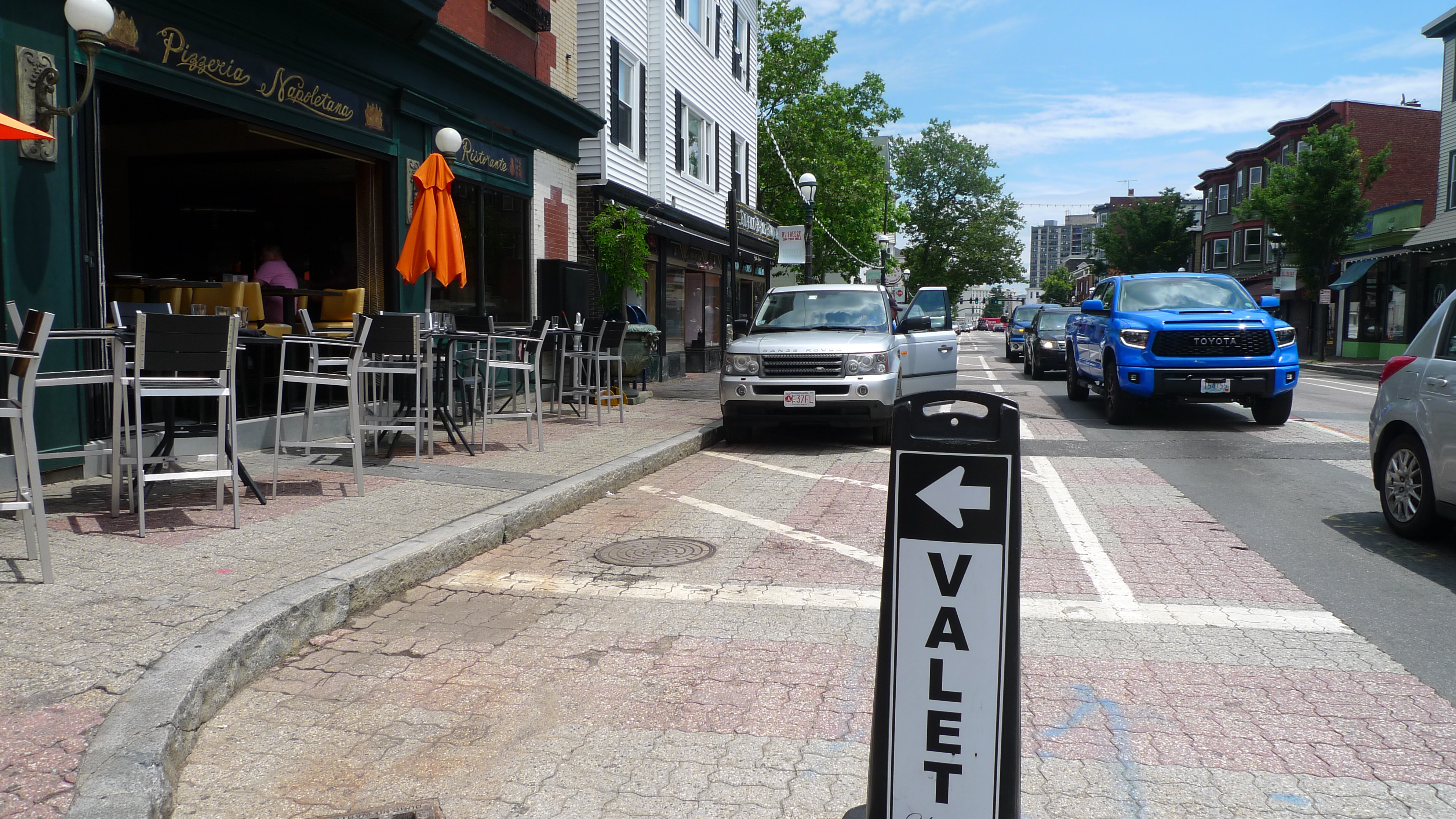 Farther along the avenue, there are some gaps in the streetscape (which can be crippling to a walkable artery like Atwells), used for valet parking. While having your Range Rover or Cadillac Escalade taken care of you while you alight at your favorite watering hole is a touch of elegance, it doesn't make a lot of sense, and the practice has contributed to the automotive chaos on Federal Hill. Is there a city department or official that decides–against sensible urban design precepts–to dedicate huge swaths of curbside to car jockeying? The hill deserves a better solution, beginning with at least a multi-story garage in one of the empty lots, perhaps accessed from Dean Street.