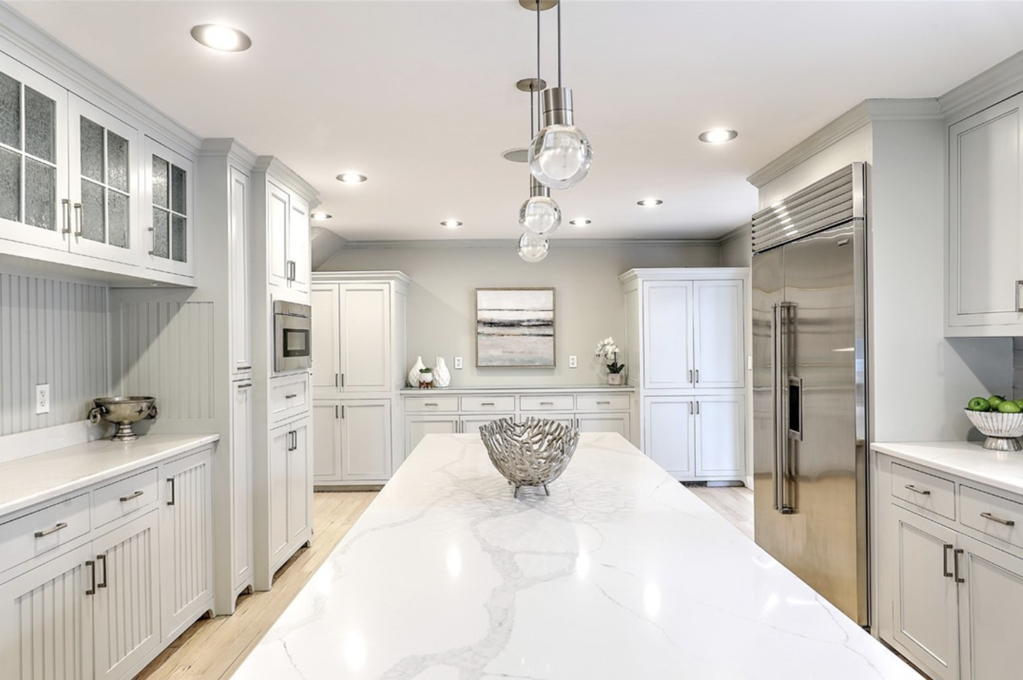 The vaulted, skylighted family room connects the kitchen to the outdoor living spaces. Crown molding accents the living room with a marble-tile fireplace that leads to the dining room that can also open for alfresco dining. French doors open to an office/possible 1st-floor bedroom. The 2nd-floor primary suite has a sitting room and walk-in dressing room with custom storage and a cedar closet.