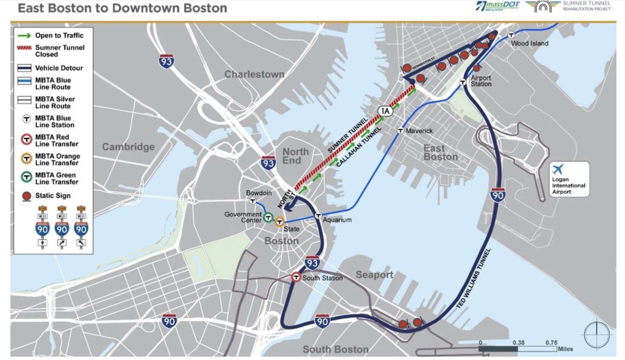The Sumner Tunnel will be closed on weekends from Fall 2023 to Winter 2023. During this time, traffic will be diverted through signed detour routes.