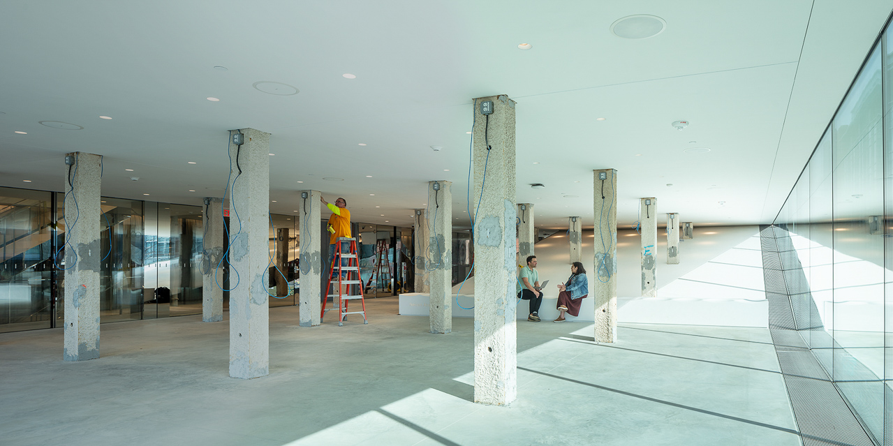 Starchitect Joshua Ramos, principal of the firm REX, and his team deserve special commendation for inserting the art center into an almost impossibly constricted site, may have been influenced by the initial donor, Ronald O. Perelman. University Architect Craig Barton’s disingenuously claims that “input from existing or potential donors is not a consideration in architect selection for projects at Brown” (never mind that REX also designed the Perelman Arts Center, a similar boxy container at the World Trade Center). Consequently, having shoehorned this new structure between the Granoff Center for the Creative Arts and the Department of History, half of the PAC’s mass is underground. Thus, the rehearsal theatres and the windowless practice rooms are reached through claustrophobic hallways–more fallout shelter than passageway to musical study.