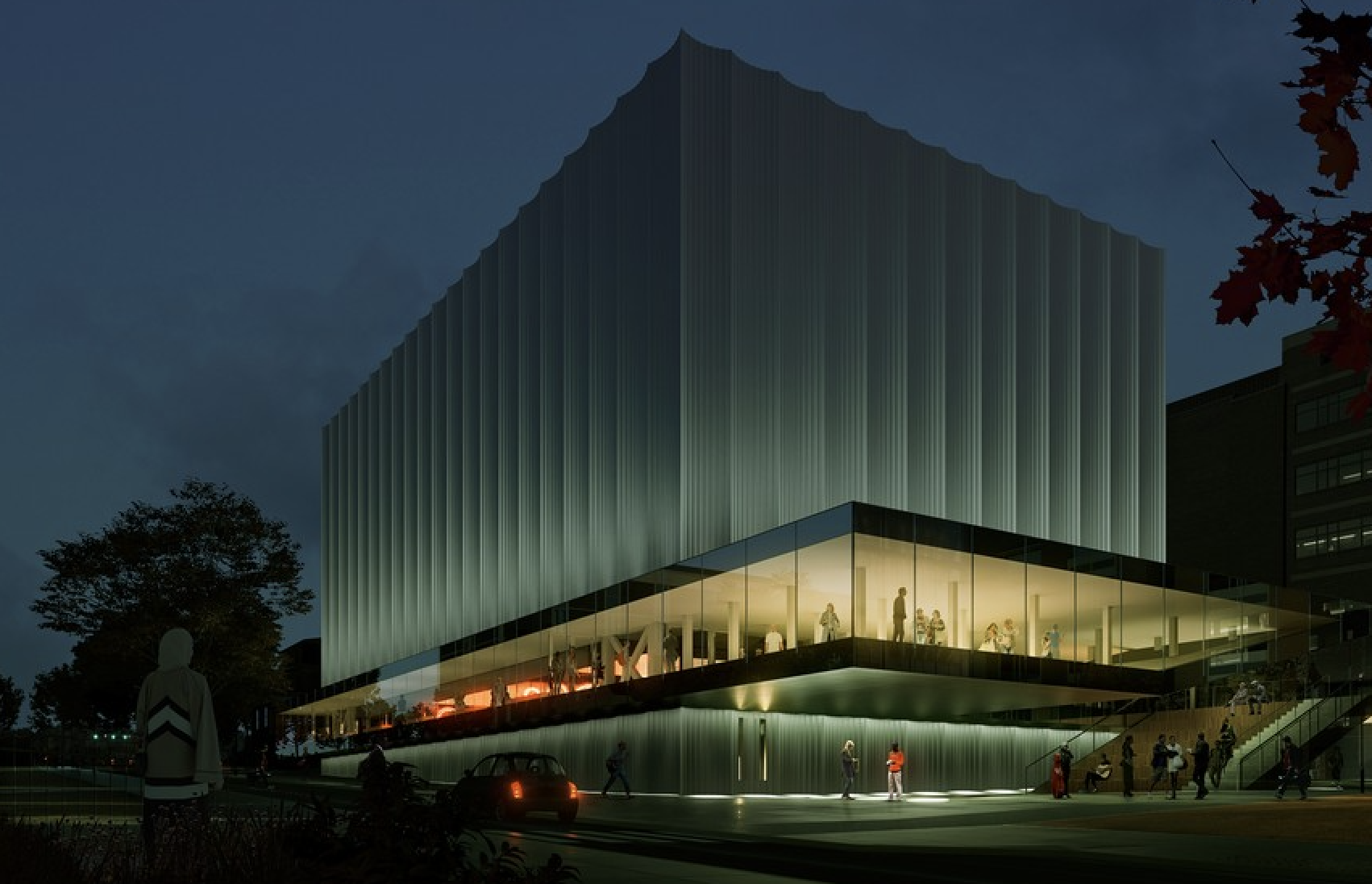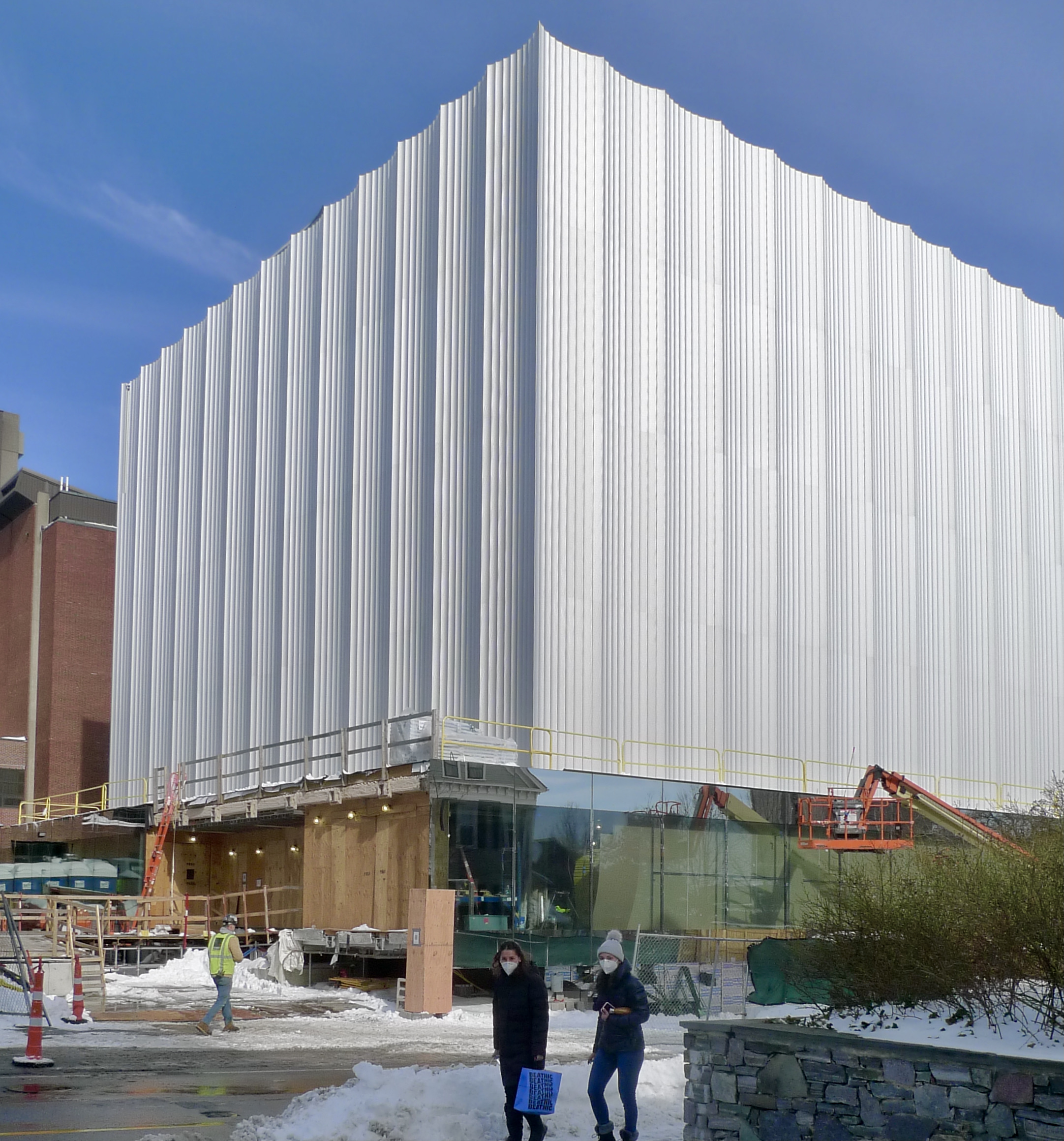 But a structure in the center of a crowded college campus is not a stand-alone piece of art. As Kim Salerno put it, “A jewel box is great, but will the urban gestures deliver?” I asked the former Newport planning board member to give her thoughts on the PAC. “I love the new building materials, surfaces and textures,” she replied, “and I love the icy quality of the design, but I really want to see how the new architecture relates to the old.”