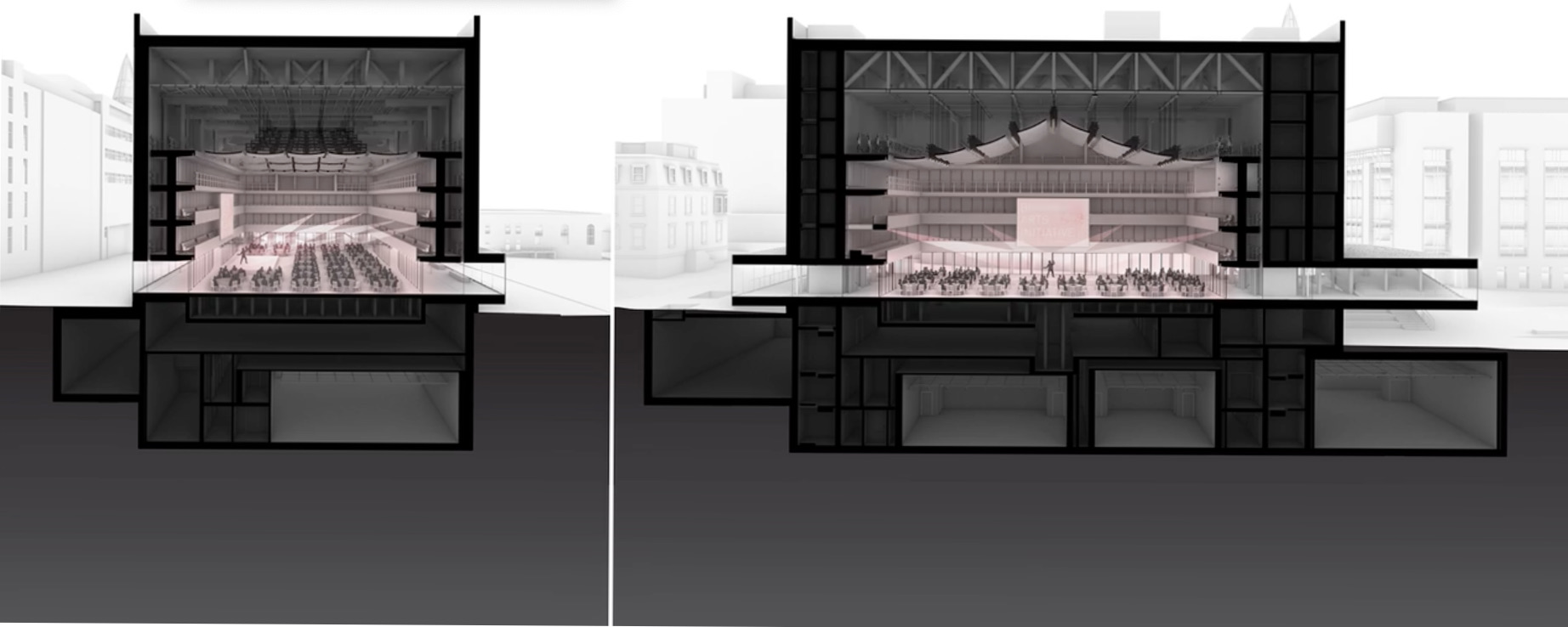 What is now just a mysterious, over-scaled block of faceted aluminum, may, in fact, do some pretty exciting things within its 118,000-square-foot package. The PAC will offer five stage and audience configurations in a single space. “All six surfaces of its shoe-box shaped main hall,” the architects note, “modulate physically and acoustically through automated and manually assisted performance equipment.” (Translation: This expensive structure will be costly to maintain.)