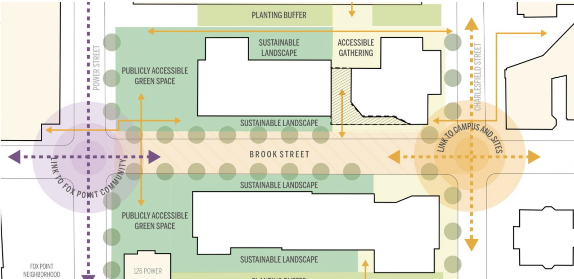 - add publicly accessible green spaces at the southern end of both buildings (at the two northern corners of the Brook and Power street intersection), creating transitions from the surrounding community to the residence hall site that complement the neighborhood’s character;