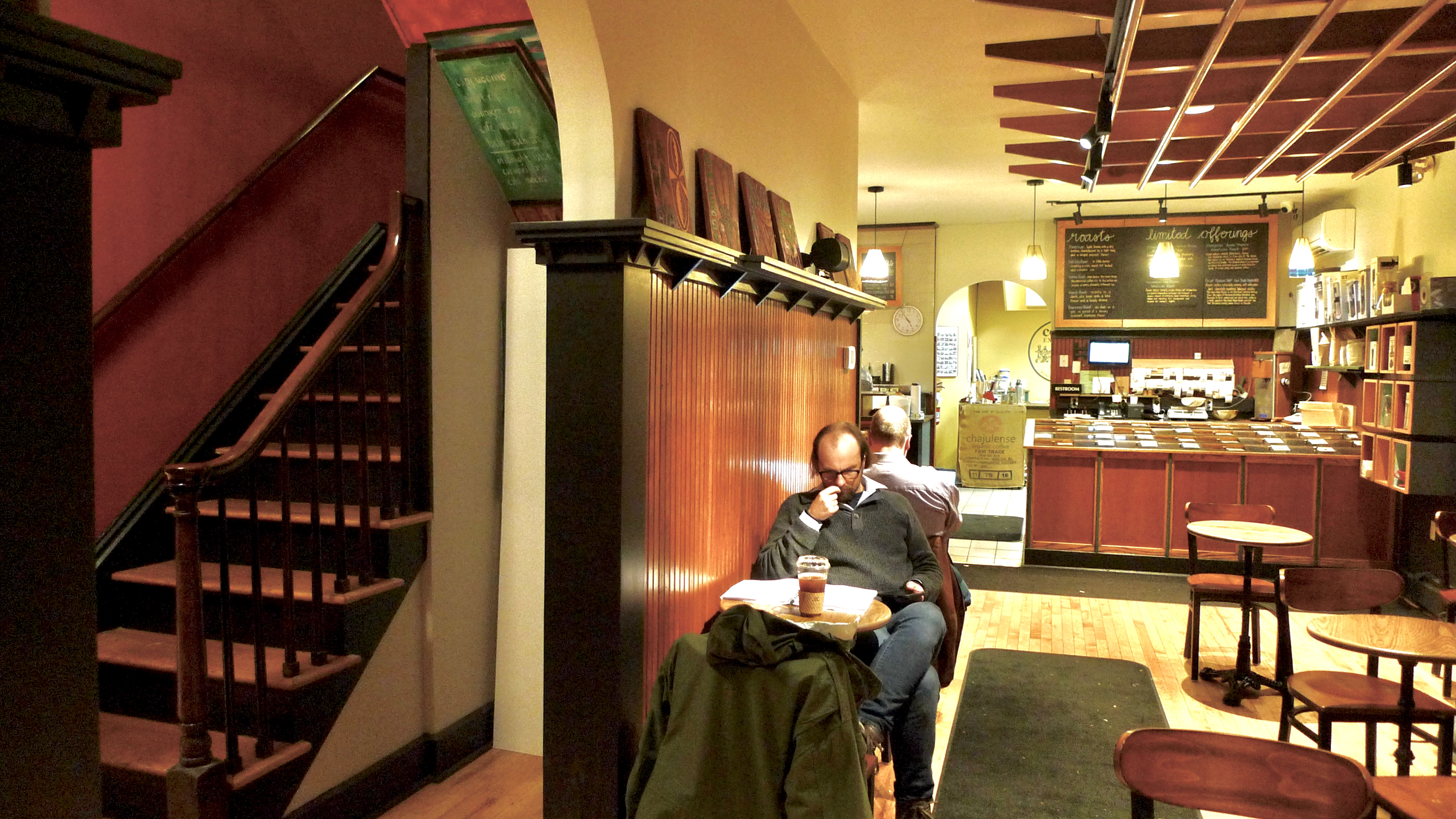 Yet, the Coffee Exchange is open and it seems to be as cozy and welcoming as ever. Incredibly, it appears as if nothing has changed–it would feel like a homecoming for a RISD alumnus from the Reagan years returning to Wickenden Street for an espresso. Basically, the business was cleaned up–or what the architect Stephanie Metz calls a “subtle refresh.” The tables are the same, but the counters have been replaced, and the brightwork on the new coffee-making equipment sparkles. Overflow space has been enlarged by the opening of the second floor, which can hold another two dozen customers. The opening of the staircase to the upstairs greatly improves circulation by allowing an easier flow of traffic–an unbroken loop instead of the old U shape.