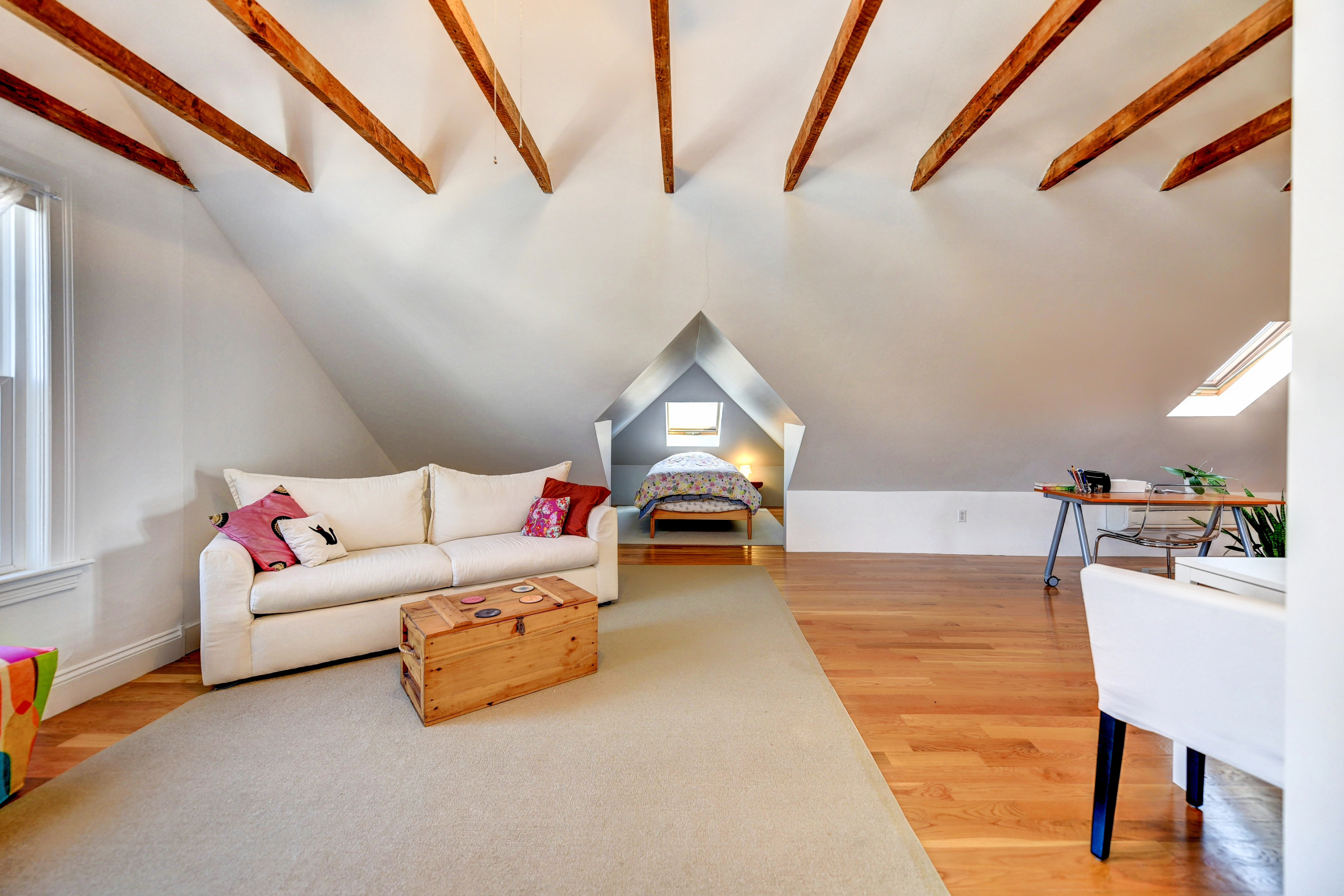 The townhouse continues up to a spectacular open studio on the 3rd floor showcasing a cathedral ceiling, exposed beams, 3 skylights, two bedroom areas, a full bath, and a deck. The delightful, fenced backyard includes a patio and perennial plantings. There is a two-car detached garage plus additional outside parking spaces.