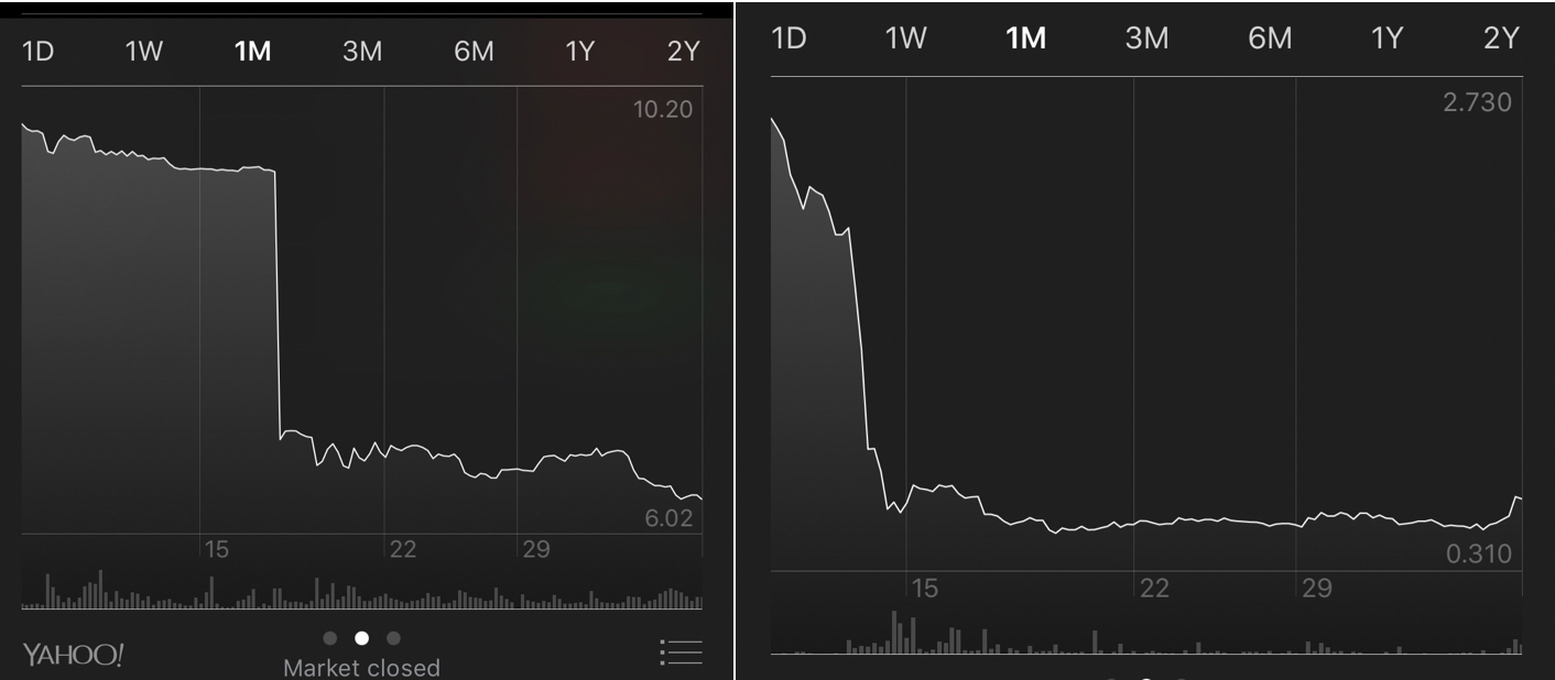 Gannett’s stock has fallen from a 52-week high of 11.99 to a Friday closing of 6.01 — a 4.9.8 percent fall. And, McClatchy’s stock is in free fall, dropping from a 52-week high of 8.25 to .499 per share — a 94 percent decline.