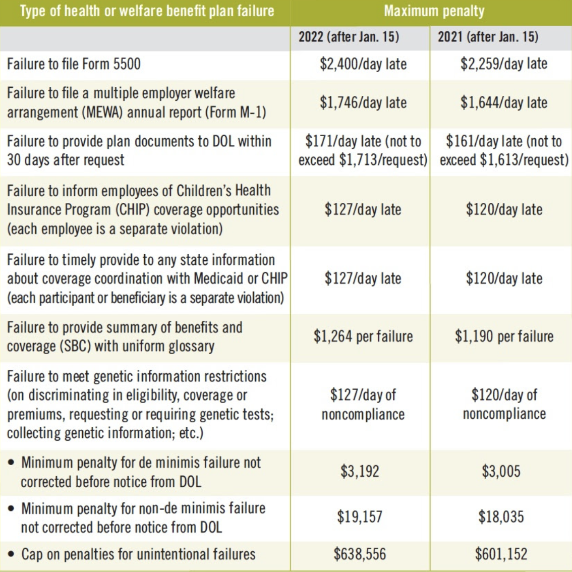 These penalties cover a wide range of benefit plan compliance failures. The DOL has the discretion to impose lower penalties in some instances—such as pursuant to programs designed to encourage Form 5500 filing—so not all violations will result in the maximum permitted penalty. And while relief granted in connection with the COVID-19 public health emergency allows more time to provide certain disclosures, penalties could potentially be triggered if the terms of that relief are not met.