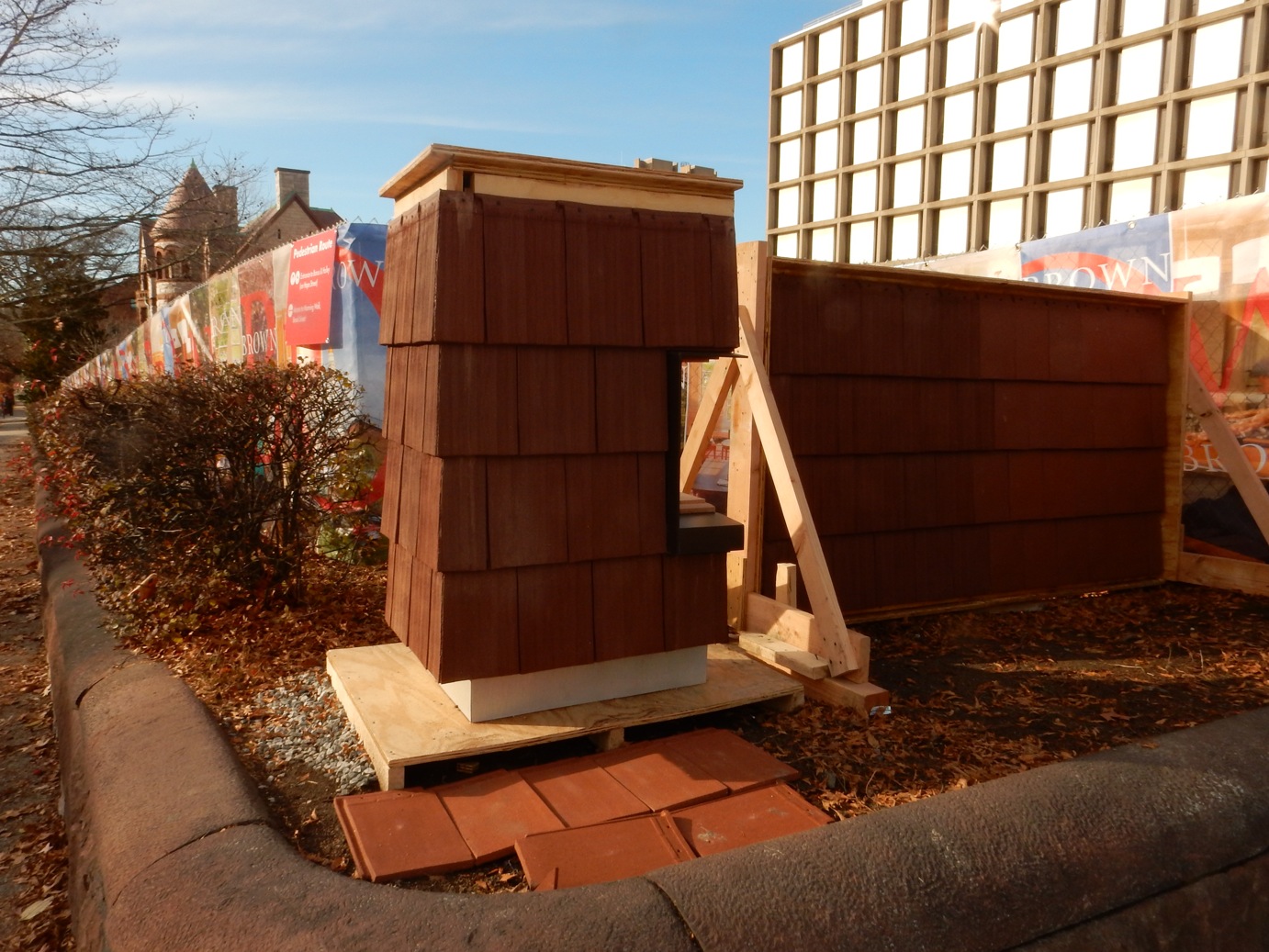 Brown (the school) broke ground recently on its new applied math building, a home for faculty and grad students to be displaced by Brown’s proposed new engineering building. Both will be near Hope Street. A source told me that a “mockup” of materials to be used was already up at the construction site, at the corner of George and Hope streets in the parking lot of the Barus and Holley Building, which is, regrettably, not at risk.