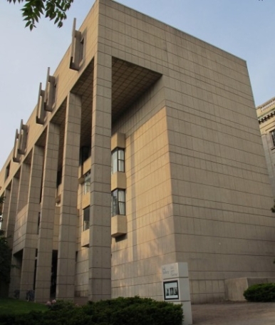 1971. Philip Johnson. There is a sort of faux nobility to this Brutalist Brown University building, whose pilotis (modernist jargon for columns) soar, if it is possible for concrete to soar, up three stories to uphold a thrusting fourth story that forms a sort of entablature (classical jargon for that which columns hold up) for this building, whose saw-blade rooftop literally scrapes the sky on the horizon of College Hill.