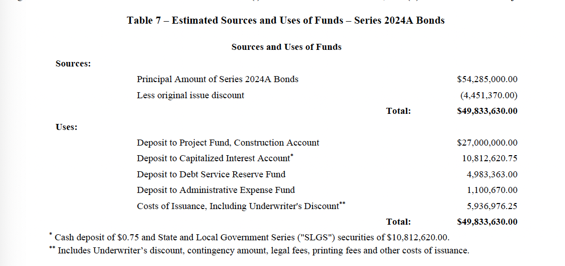 According to the use of Estimated Sources and Funds, the stadium owners -- Brett Johnson and his team -- are investing $43 million of the total cost, which exceeds $128 million.