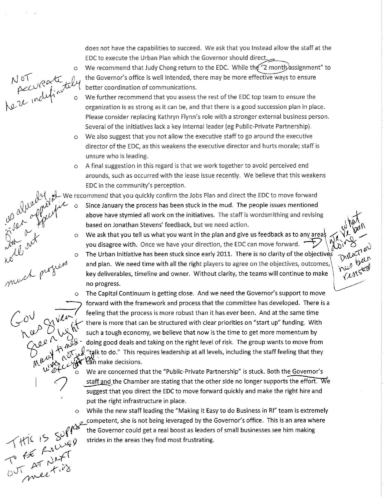 In addition, the three RIEDC Board members were highly critical of the implementation and leadership of the Urban Initiative being developed by EDC. “We also suggest that you consider removing Doris De Los Santos from the role she is playing on the Urban Initiative. While she is a terrific person, it is our thought that she does not have the capabilities to succeed. We ask that you instead allow the staff at the EDC to execute the Urban Plan.”
