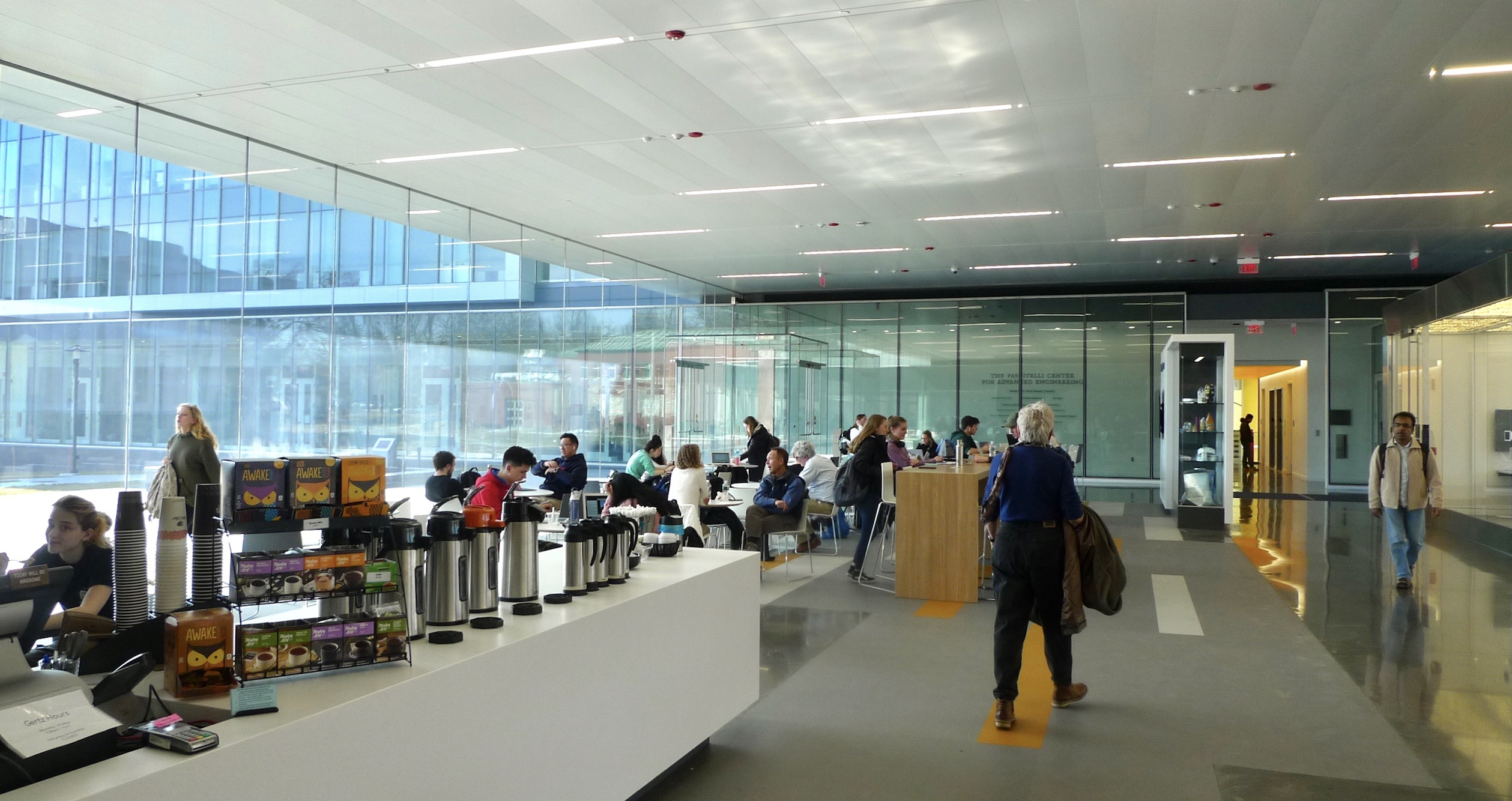 But the missteps of the past fade when one enters the sparkling, light-collecting Fascatelli Center. Its strong, clean lines and pristine glass and metal surfaces are the perfect metaphor for a research center that explores the physical aspects of our world from civic and environmental engineering to Nano-technology and cyber-security.