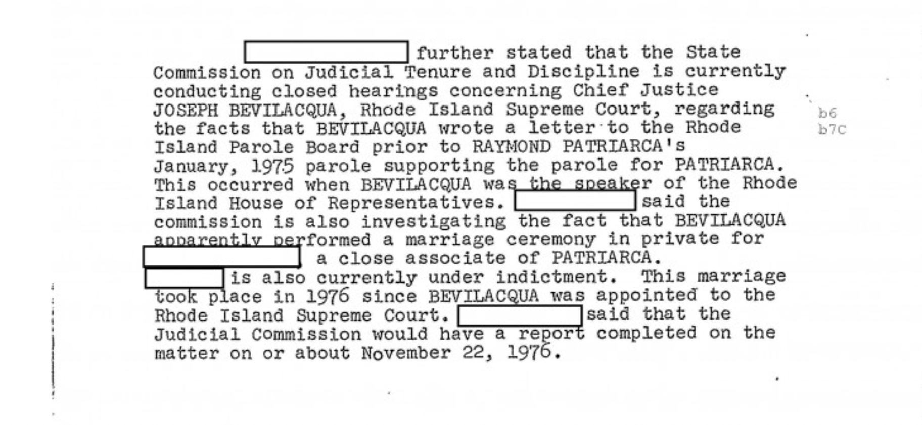 According to the FBI file on Raymond Patriarca secured by GoLocal through a Freedom of Information Act request, he had a relationship with Bevilacqua that went back years.
