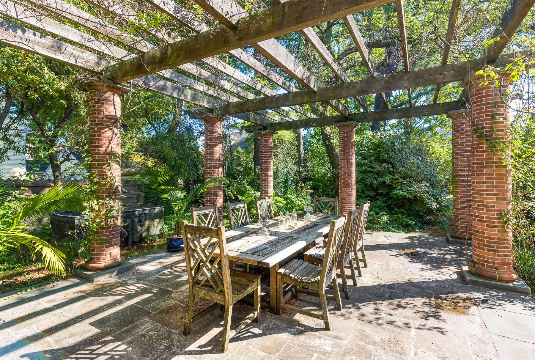 There are 8 bedrooms, 5 full baths, 4 half baths, a working elevator, a home gym plus spa/sauna, an al fresco dining patio, several bubbling fountains, private porches, and all of the home’s systems have recently been updated.