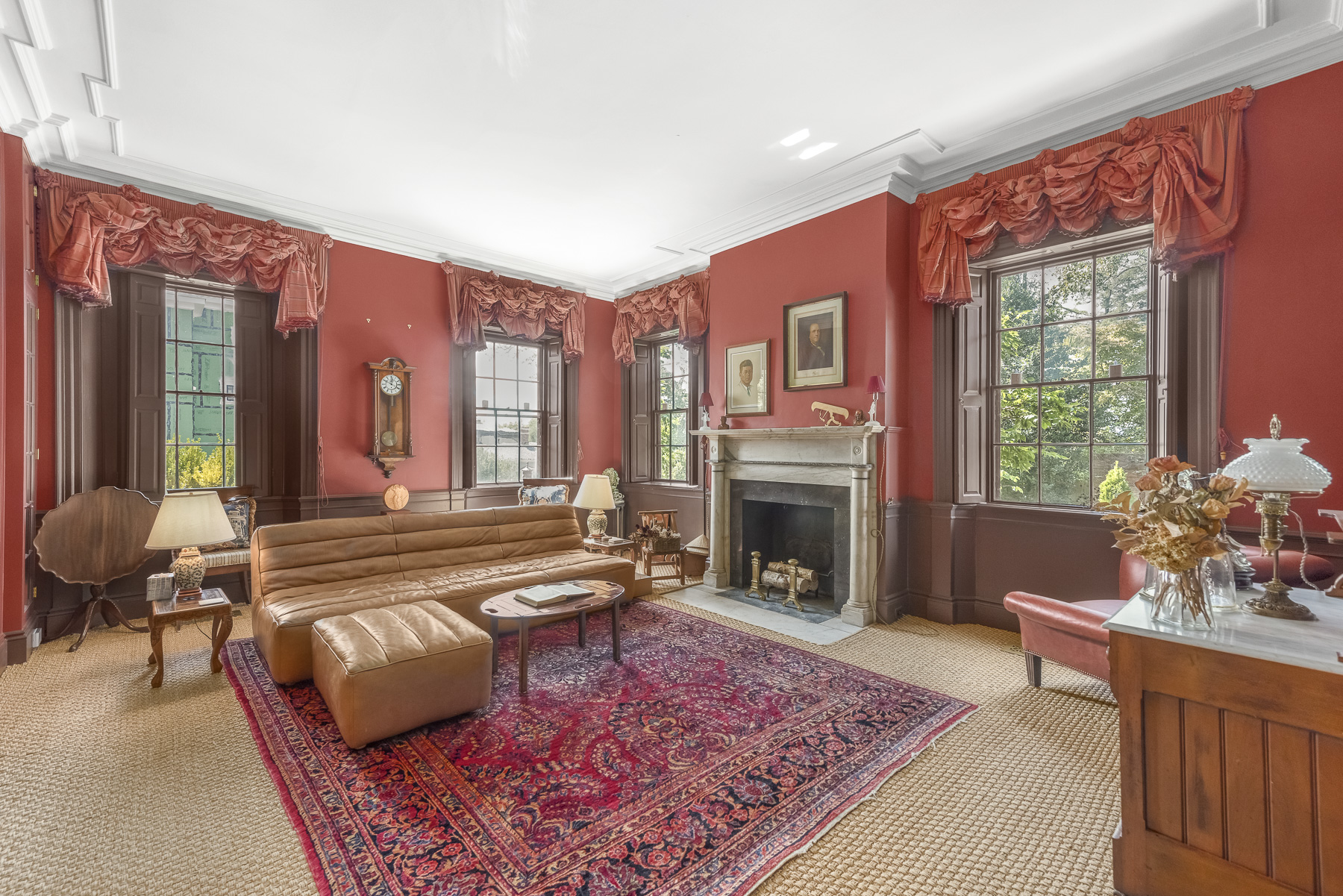 The estate remained in the family for three generations. Today, the home is one of Providence's loveliest examples of the era, with welcoming rooms including a dramatic entrance with a curved staircase, an exquisite dining room with rare French wallpaper by Dufour, impressive "peacock" wallpaper made in China in the living room (the peacock became the Carrington family crest), significant two-story home office, chef's kitchen, and large primary suite.