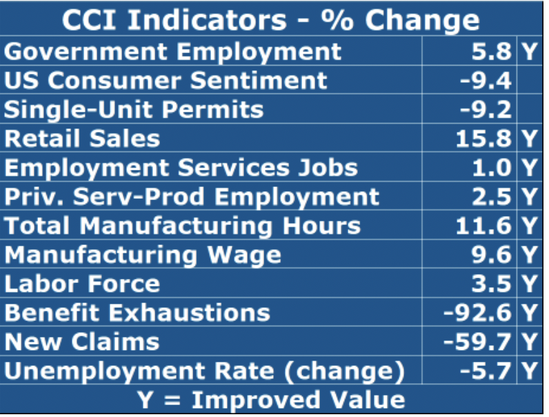 GET THE LATEST BREAKING NEWS HERE -- SIGN UP FOR GOLOCAL FREE DAILY EBLASTFor September, the Current Conditions Index rose from its revised August value of 75 to 83, as ten of the twelve CCI indicators improved. Part of our recent strength is the continuation of easy “comps” from last year. In spite of this, the CCI has remained in expansion territory since April, and hopefully will continue the broadening of the pace of our economy.