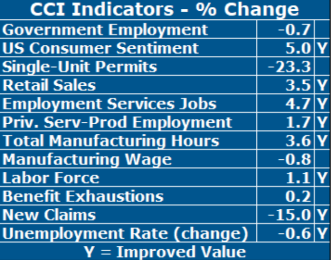 At this point, as we continue to move beyond a one or two month period of declining values, we can begin to disregard the “don’t place too much weight on a single month’s values” rule. Because of this and the fact that the national economy appears to be slowing, along with the economies of Europe and Asia, the progression of CCI values since May cannot be so easily dismissed. While Rhode Island’s economy is continuing to grow (the CCI has remained above 50), our rate of growth appears to be slowing. The string of lower CCI values indicates that the foundation of this recovery has begun to stand on fewer “legs,” as our negatives have been gaining relative to our positives, although the positives still dominate (for now at least).