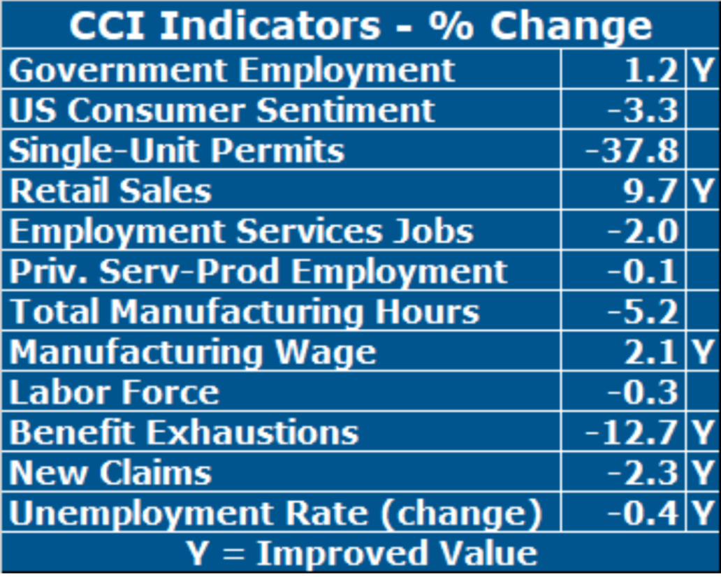 March’s performance did have a few bright spots, but only a few. The strongest indicator performance in March was once again Retail Sales, which has held up surprisingly well, growing by just under 10 percent. Rhode Island’s goods-producing sector fared poorly again in March. The Manufacturing Wage rose again (+2.1%), but this was only its third increase since September. New Claims, the most timely measure of layoffs, improved in March (-2.3%), which was only its sixth improvement in the last year. More critically, this was the only one of the CCI’s leading indicators to improve in March.
