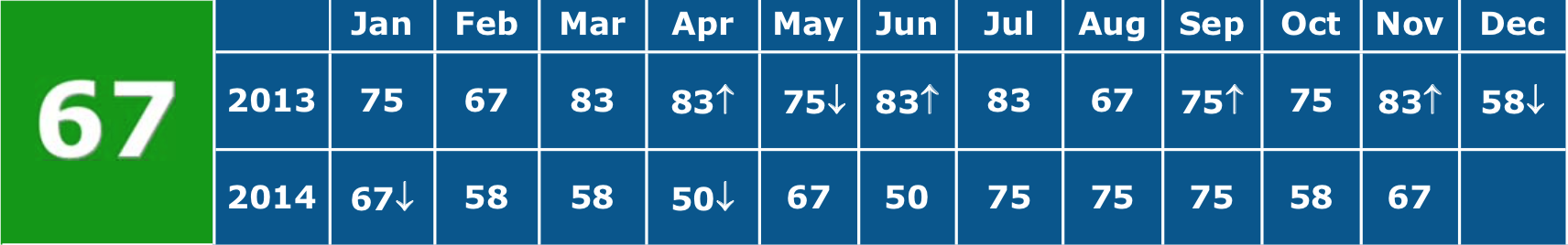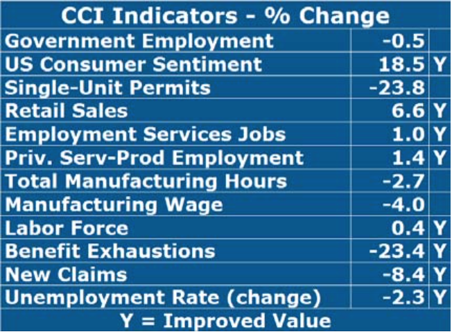 The Current Conditions Index (CCI) is a monthly indicator that details the present state of the Rhode Island economy by following the behavior of key economic indicators pertaining to housing, retail sales, fiscal pressures, the employment situation, and labor supply. The November ranking was a 67, up from a 58 in October, but down from a 75 in September, August, and July.
