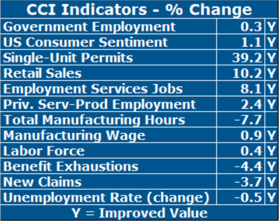 As for individual performances, there was a great deal of strength displayed among individual CCI indicators along with the continuation of several recent uptrends, a most encouraging development. If we focus on the leading economic indicators contained in the CCI, there were several welcome developments. First, and foremost, New Claims for Unemployment Insurance, the most timely measure of layoffs, improved again in December, for the seventh time in the last eight months, resuming its longer-term downtrend. Along with this, Employment Service Jobs, a leading indictor of employment, rose strongly again as it has for every month since March. Taken together, these changes suggest a trend toward higher employment accompanied by fewer layoffs in the coming months, necessary elements if Rhode Island is to sustain its recent momentum. Several non-leading indicators turned in noteworthy performances, most notably Rhode Island’s star performer for some time now, Retail Sales, which rose at a double-digit rate (+10.2%), capping what turned out to be a very strong holiday shopping season.