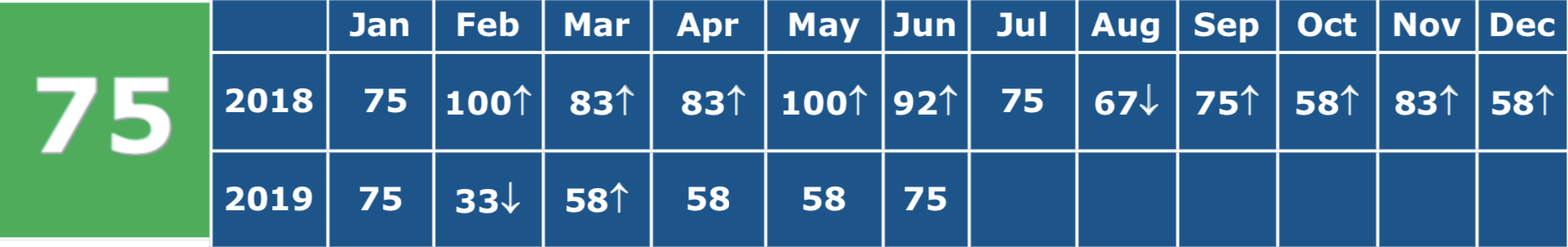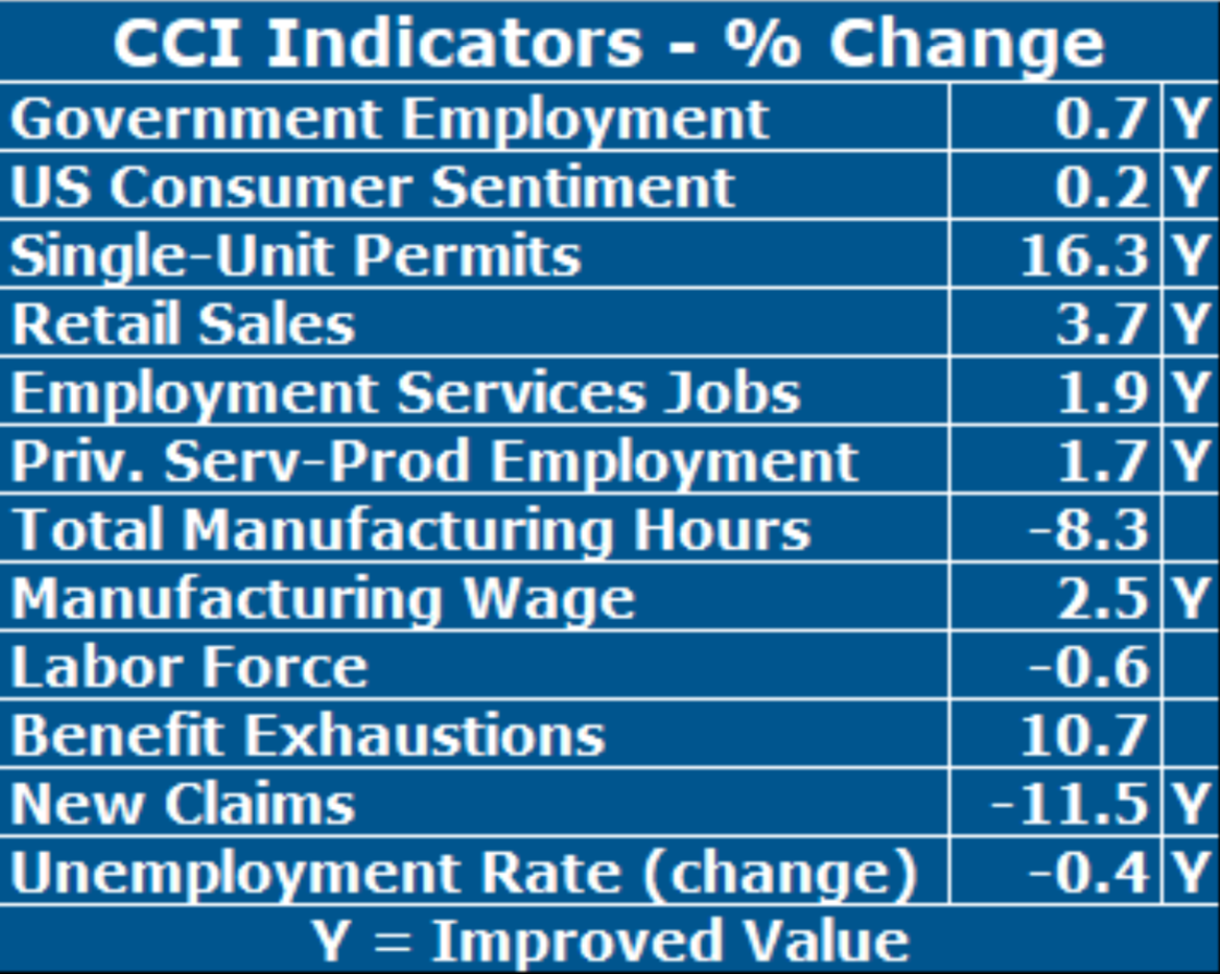 The Current Conditions Index for June rose to 75, tied for its highest value in 2019, as nine of twelve indicators improved, including four of its five leading indicators. While several indicator performances this month were improvements over what they had been earlier this year, an almost equal number turned in weaker performances, continuing the trend where our negatives are substantially offsetting our positives, which adversely affects growth and our overall economic performance.