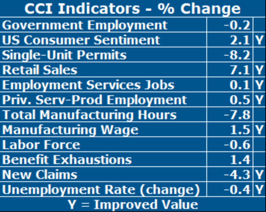Unemployment Rate, while touted as the sole indicator of our state’s economy by state government, remain meaningless. Citing their values does, however, provide a great way for them to mislead with statistics. Sadly, May was the twelfth consecutive month for which the CCI has failed to exceed its year-earlier value, reflective of weakening momentum.