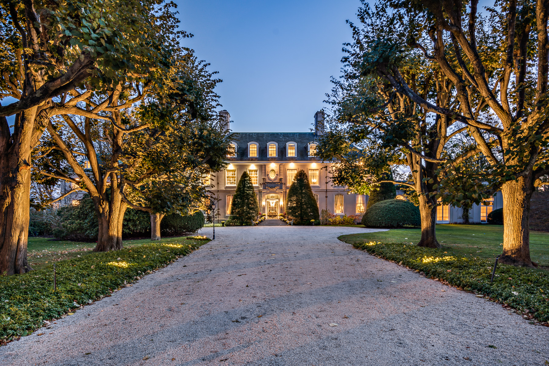 Built in 1927 by renowned New York architect Charles A. Platt, “Bois Doré” is gracefully sited on four private acres off Bellevue Avenue. The 23 Bedroom French Chateau was originally commissioned for William Fahnestock, founder of Oppenheimer & Co. Inc., and is approached through wrought iron gates and a dramatic tree-lined driveway. Wrought iron and glass front doors complement the timeless limestone façade and center the two wings of the home. The marble foyer entrance and loggia open to a beautiful brick terrace overlooking the expansive rear yard. An 85 ft great hall extends to either side, giving the space a sense of balance and grandeur. The East Wing is anchored by the chef’s kitchen which features dual Viking ranges beneath an antique white cast iron hood a Butler’s pantry, family room, and sun porch. The adjacent dining room is adorned with Martin Battersby trompe l’oeil art and a marble fireplace, one of eight in the estate. In the West Wing lies the drawing-room, study, and the nearly 2000 sq ft ballroom, the largest of any private residence in Newport. An 8ft antique Regency chandelier sparkles from the ceiling and harkens guests to a by-gone era of glitz and glamour. The upper levels can be accessed by two staircases or an elevator. Bois Dore has an illustrious history, notable ownership includes Campbell Soup heiress Elinor Winifred Dorrance Hill Ingersoll and later Oil baroness Carolyn Mary Skelly. An architectural masterpiece steeped in Newport society.