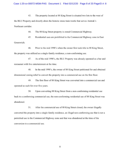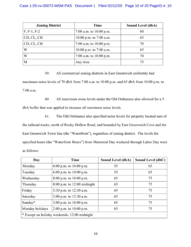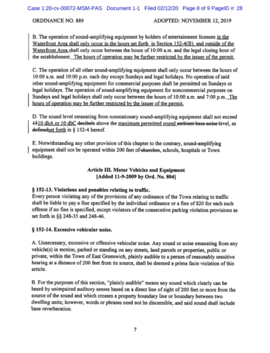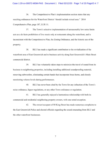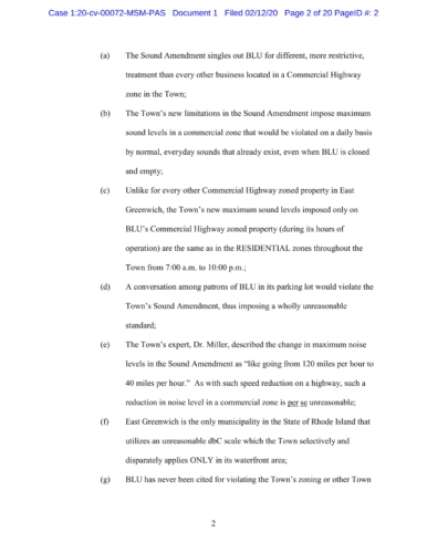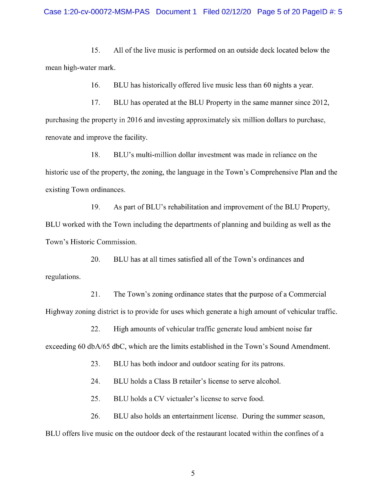 The lawsuit claims, "The Town’s Sound Amendment makes it impossible to run long-standing, allowed commercial uses in the waterfront Commercial Highway district within these restrictive limits. The Sound Amendment is unconstitutionally vague as it gives the Town Council free reign to terminate BLU’s license based on an undefined standard and has knowingly created a situation where BLU cannot operate its lawful business and not violate the disparately applied standards in the Sound Amendment. The enforcement of the Sound Amendment would also constitute an unconstitutional taking, insofar as ANY commercial operation in this Commercial Waterfront District would violate the Town’s Sound Amendment because of the existing ambient sound conditions at the property and the unattainably low sound levels established by the Town."