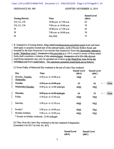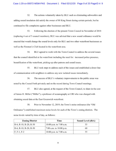 “A conversation among patrons of BLU in its parking lot would violated the Town’s Sound Amendment, thus imposing a wholly unreasonable standard,” the suit alleges. “East Greenwich is the only municipality in the State of Rhode Island that utilizes an unreasonable dbC scale with the Town selectively and disparately applies ONLY in its waterfront area.