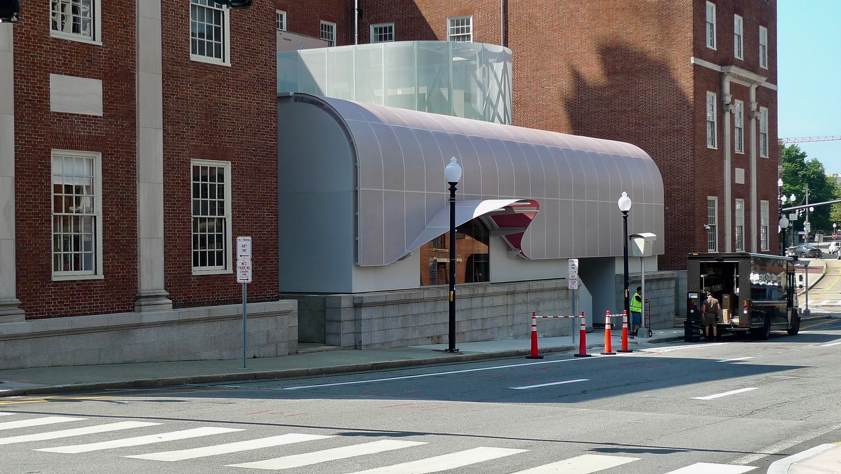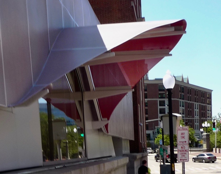 This curving metal-screen on Steeple Street is distinctive, but it makes no attempt to acknowledge the brick mass behind it.