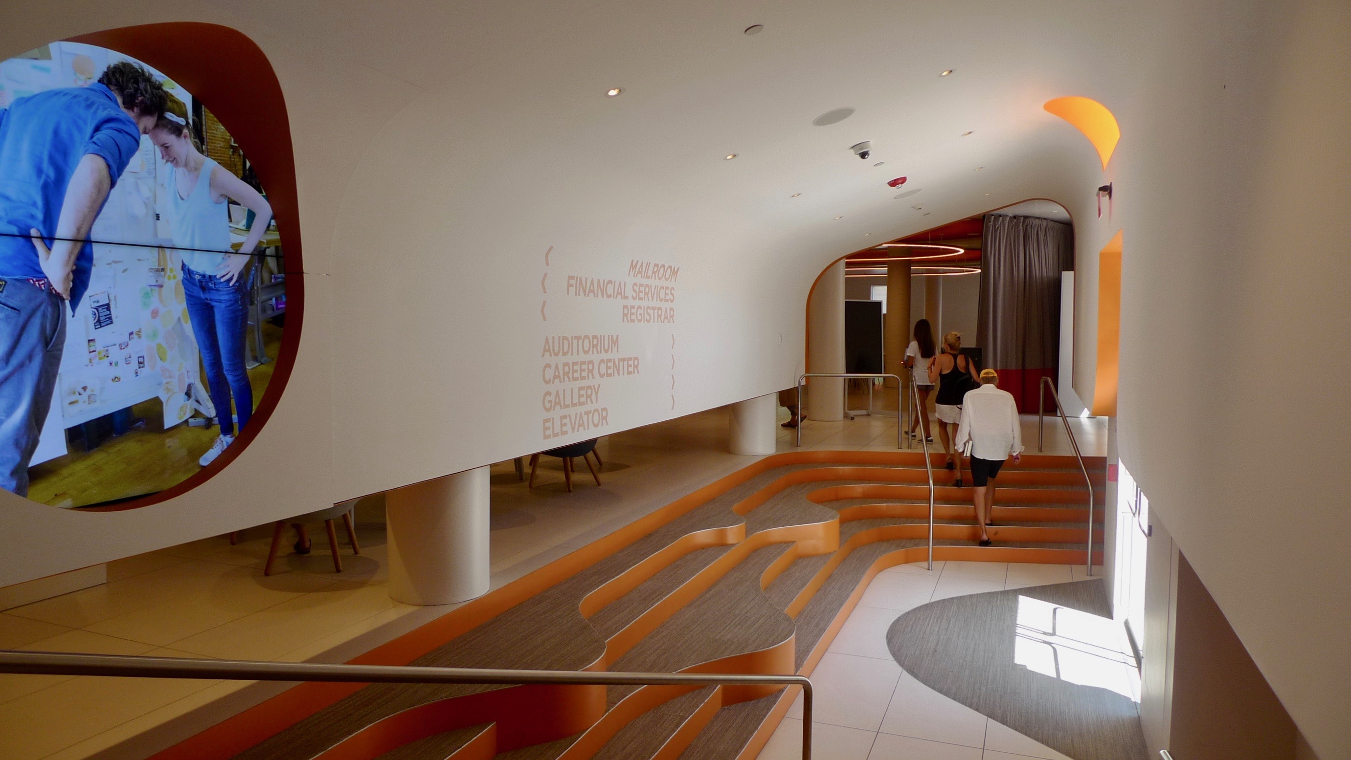 The no-nonsense mailroom avoids the orange accents and the Euro Trash ambience of the rest of the student center.The former office building that houses the student center is handsome and dignified. The orange paint behind the neoclassical fanlight is the only hint of what is to be found inside.The main entrance is on Washington Street.