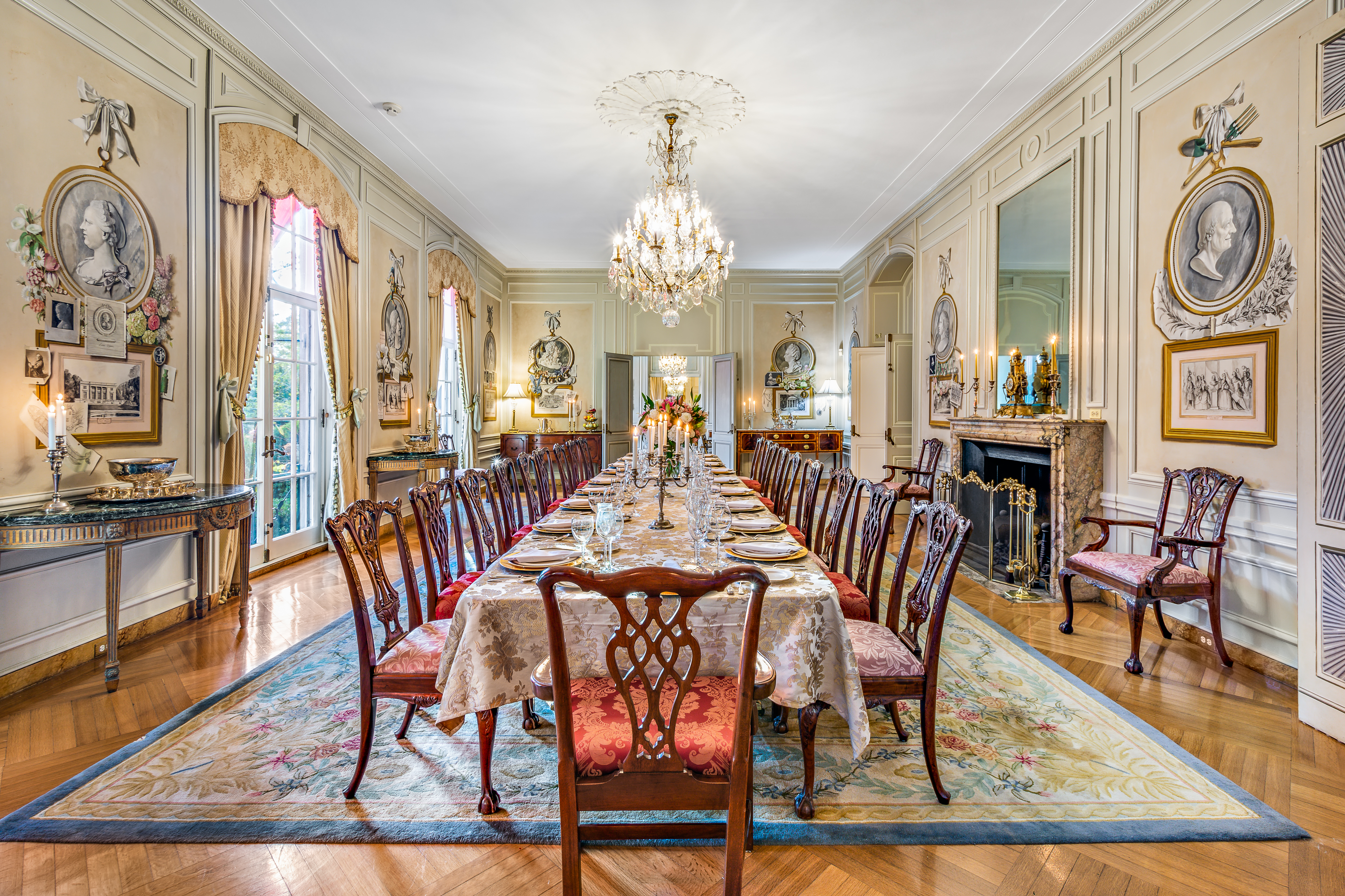 The home is adorned with details such as Martin Battersby trompe l’oeil art, a style of painting in which objects are depicted with photographically realistic detail, and the largest ballroom of any private home in Newport with an antique eight-foot Regency chandelier sparkling.