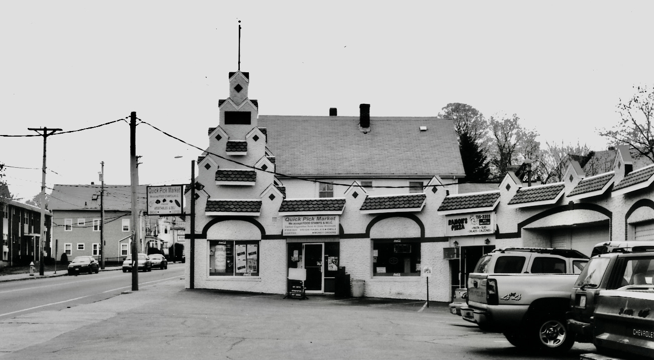 During the 1930s Pawtucket saw its share of snazzy, light-hearted buildings. “New England’s Largest Drive-In Service Station” gathers its fun from what seems a combination of Chinese, Indian, and Maya temples.