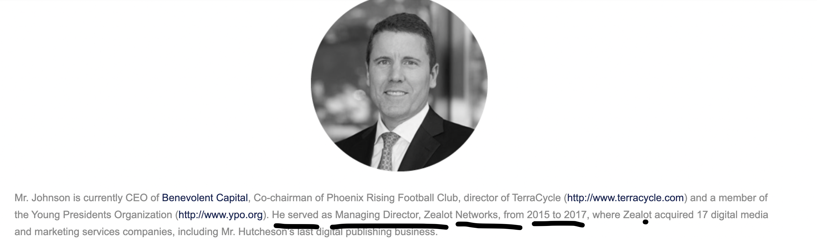 Brett Johnson in one of his business bios cites his role as Managing Director of Zealot Networks (“Zealot”) from 2015 to 2017. The company shut down unexpectantly in 2016.