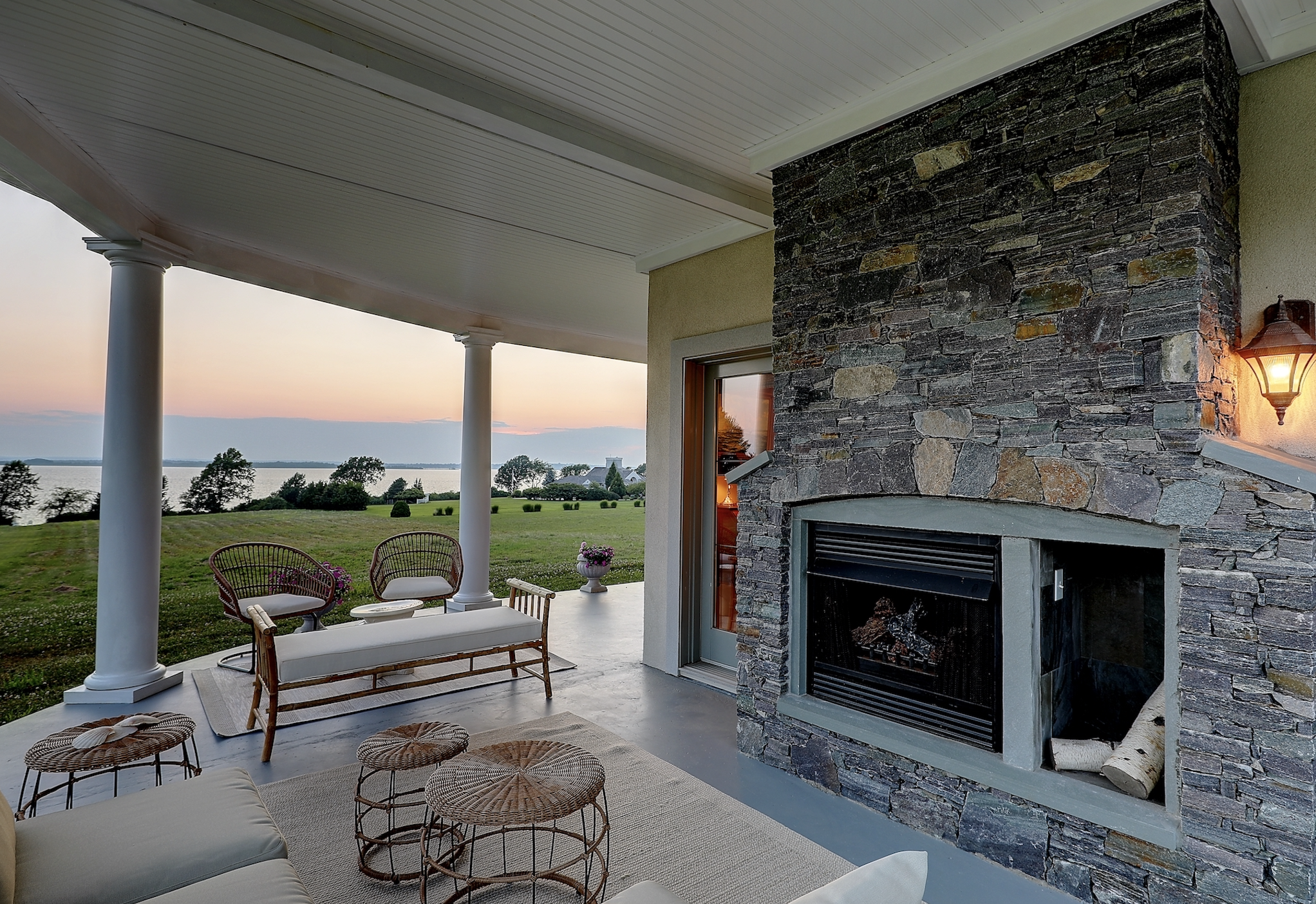 Multiple French doors open to a gorgeous wrap-around covered patio featuring an impressive stone fireplace.