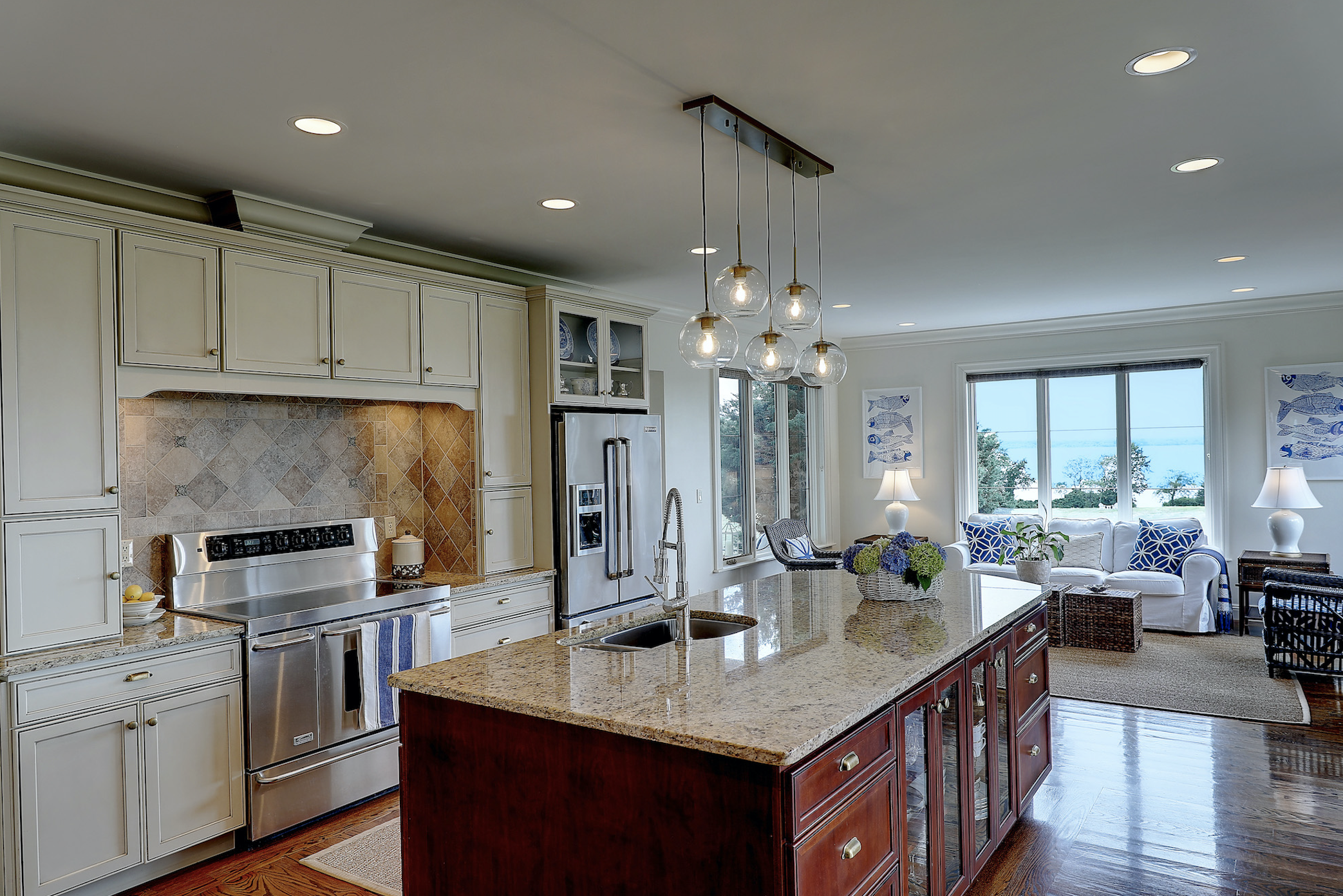 Stainless appliances and granite countertops occupy the gourmet waterview kitchen.