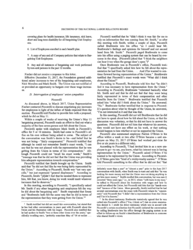 The NLRB decision found, "In this case, considering all the circumstances, the unlawful nature of the questioning is not open to serious question. Here, the top official of the Respondent had what he described as "official" meetings, one-on-one, with three different employees in his office, outside of regular work routines, for the purpose of inquiring directly of them their views on union representation, and in Smith's case, the views of other employees on unionization. None of the employees were open union supporters or activists. This was decidedly not casual questioningPiccerelli wanted to know the employees' union sympathies..."