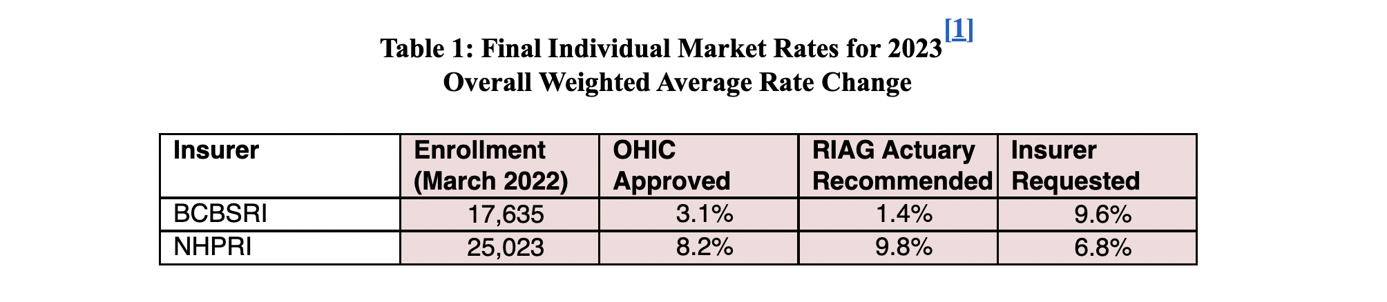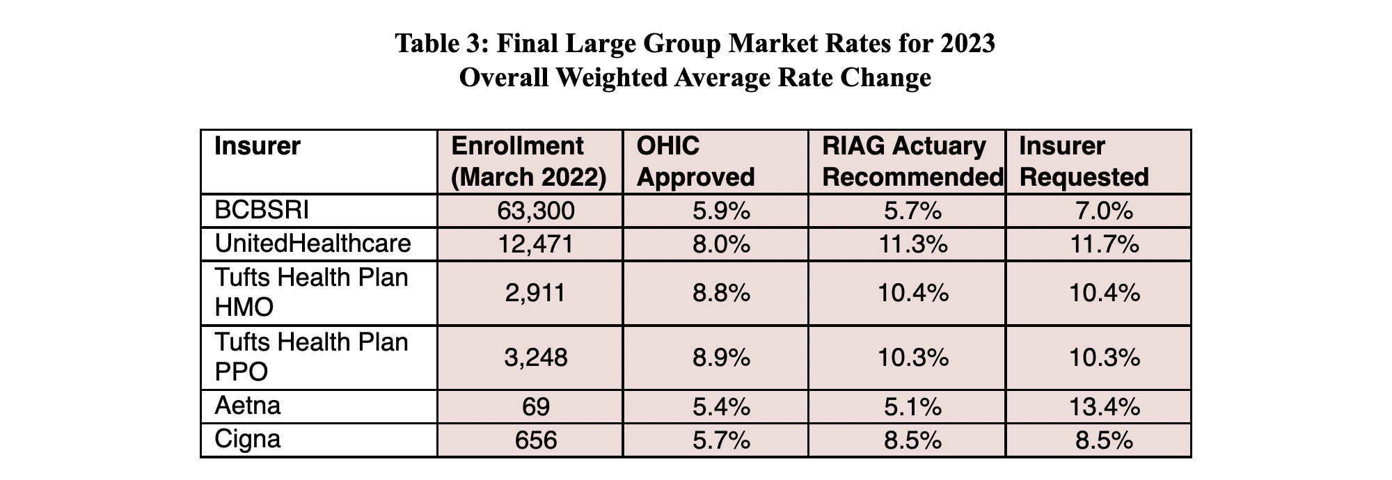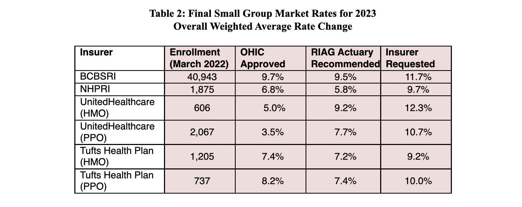 Tables 1 – 3, below, summarize the approved rates for 2023. The rate change approved by OHIC is shown along with the recommendations of the RIAG’s consulting actuaries and the rate change requested by the insurers in the May filings.