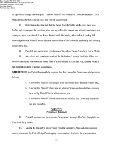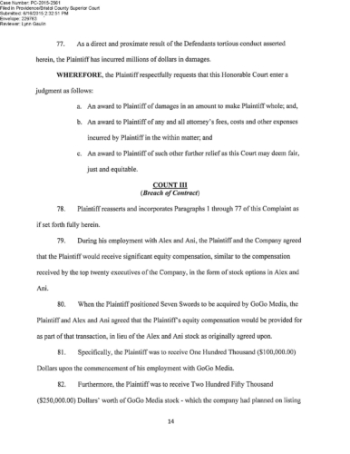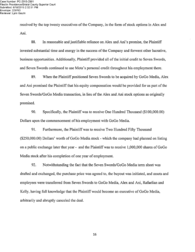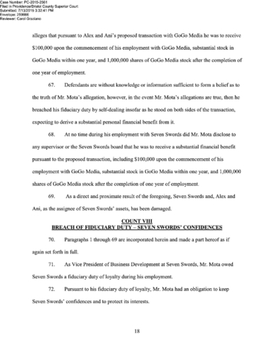 Defendants are without knowledge or information sufficient to form a belief as to the truth of Mr. Mota’s allegation, however, in the event Mr. Mota’s allegations are true, then he breached his fiduciary duty by self-dealing insofar as he stood on both sides of the transaction, expecting to derive a substantial personal financial benefit from it. At no time during his employment with Seven Swords did Mr. Mota disclose to any supervisor or the Seven Swords board that he was to receive a substantial financial benefit pursuant to the proposed transaction, including $100,000 upon the commencement of his employment with GoGo Media, substantial stock in GoGo Media within one year, and 1,000,000 shares of GoGo Media stock after the completion of one year of employment.