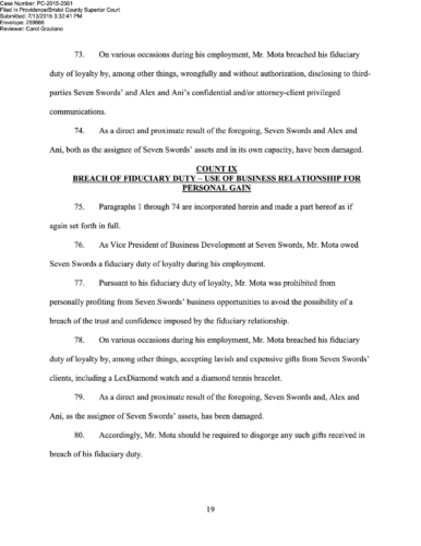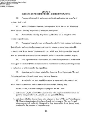 Throughout his employment with Seven Swords, Mr. Mota breached his fiduciary duty of loyalty and committed corporate waste by either making or approving considerable expenditures on Seven Swords’ corporate credit card, which were far in excess of the range of what any reasonable person would deem reasonable, and which served no corporate purpose. Such expenditures include more than $32,000 in dining expenses in an 18-month period, part of which are $9,000 in expenses at local restaurants without any supporting receipts or explanation as to the reason for the expenditure.