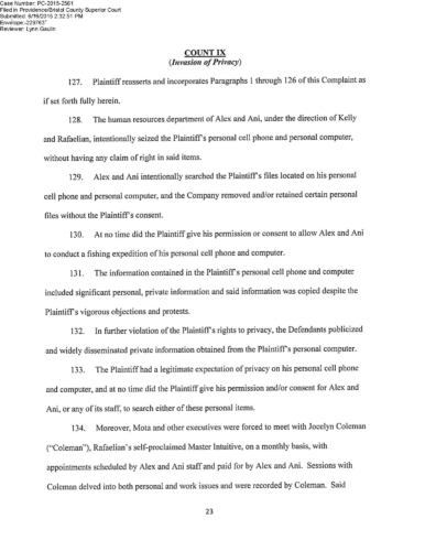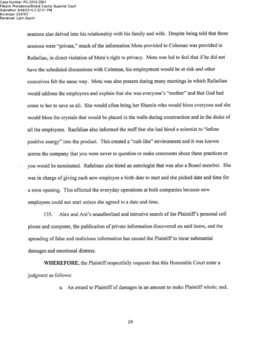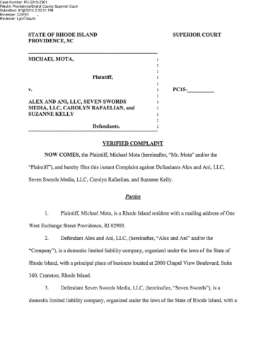 Michael Mota, a former executive at an Alex and Ani subsidiary, is accusing Alex and Ani and top executives, including Carolyn Rafaelian, of everything from manipulation of billing to avoid taxes, intimidation, threats, and taking employees' personal properties.