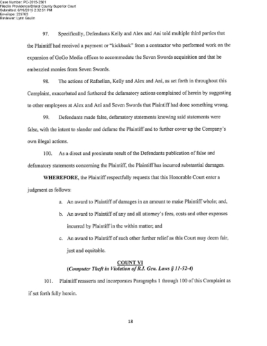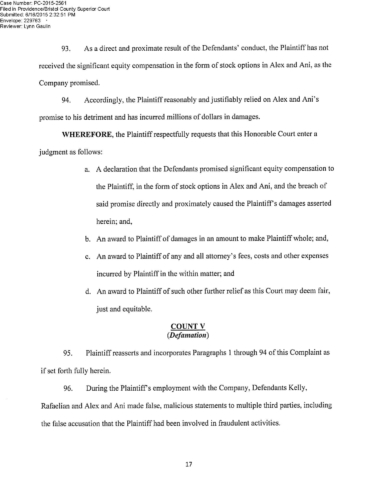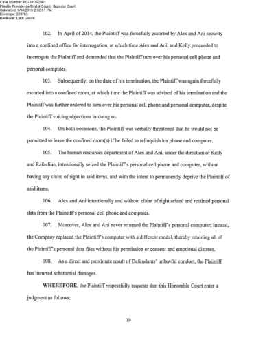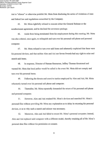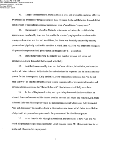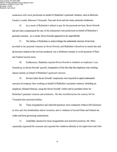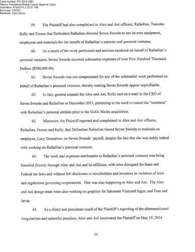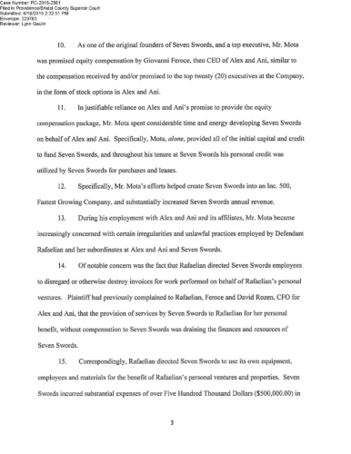 Of notable concern was the fact that Rafaelian directed Seven Swords employees to disregard or otherwise destroy invoices for work performed on behalf of Rafaelian’s personal ventures. Plaintiff had previously complained to Rafaelian, Feroce and David Rozen, CFO for Alex and Ani, that the provision of services by Seven Swords to Rafaelian for her personal benefit, without compensation to Seven Swords, was draining the finances and resources of Seven Swords.