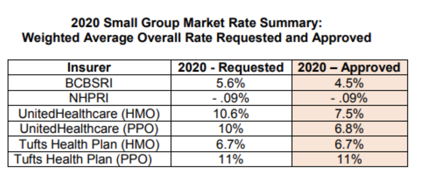 The small group market rate changes ranged from a decrease of .09% (Neighborhood Health Plan) to an increase of 11% (Tufts Health Plan).