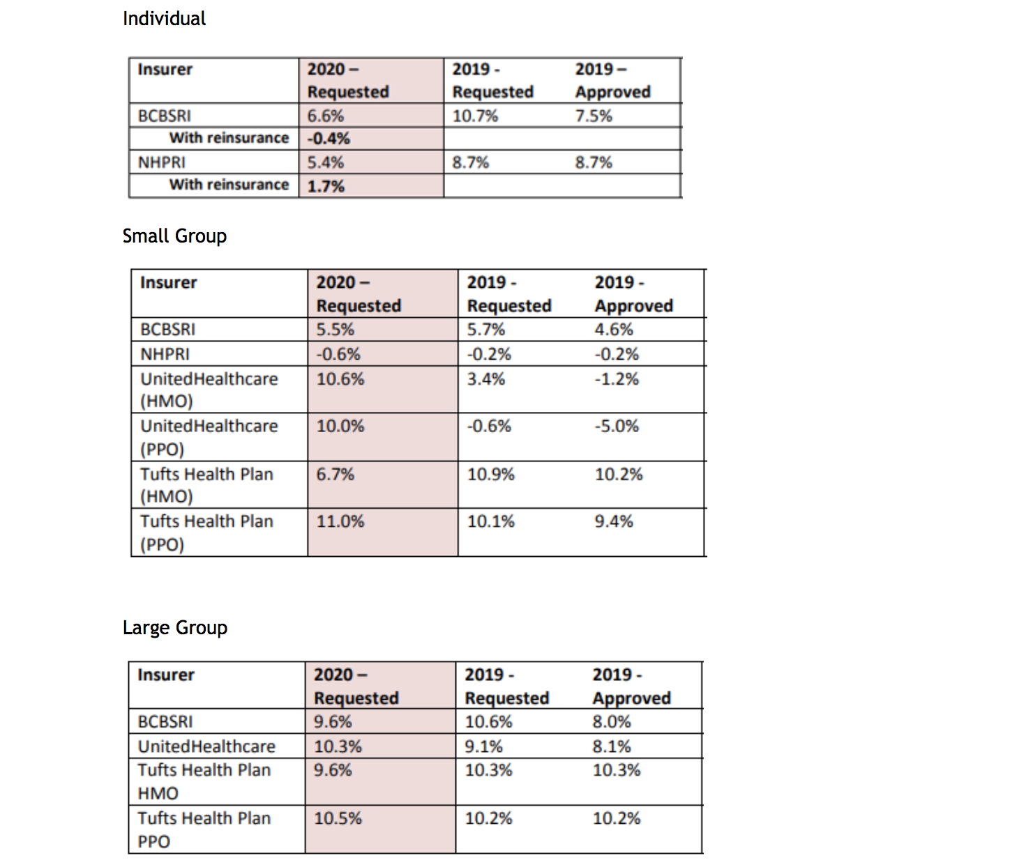 The requests filed with the Office of Health Insurance Commissioner (OHIC), for rates effective in 2020, are below along with last year’s for comparison.