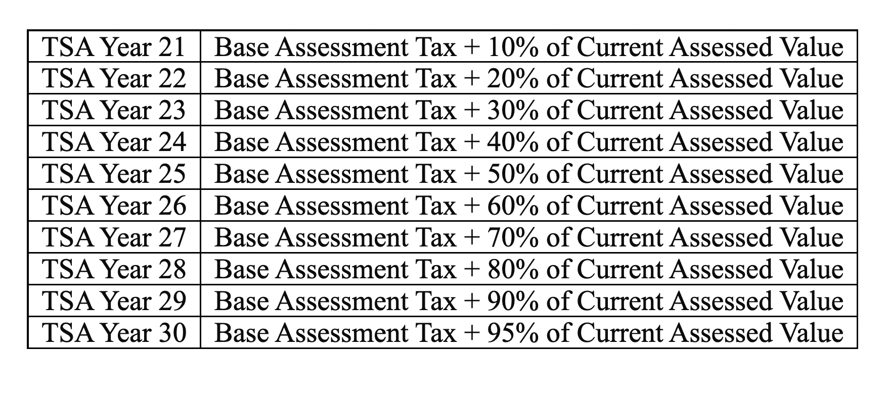 For the final ten tax years, the Property Owner will pay the Base Assessment Tax plus a percentage of the difference between the Base Assessment Tax on the Property and the taxes due and owing on the then-current assessed value of the Property multiplied by the then-current rate."