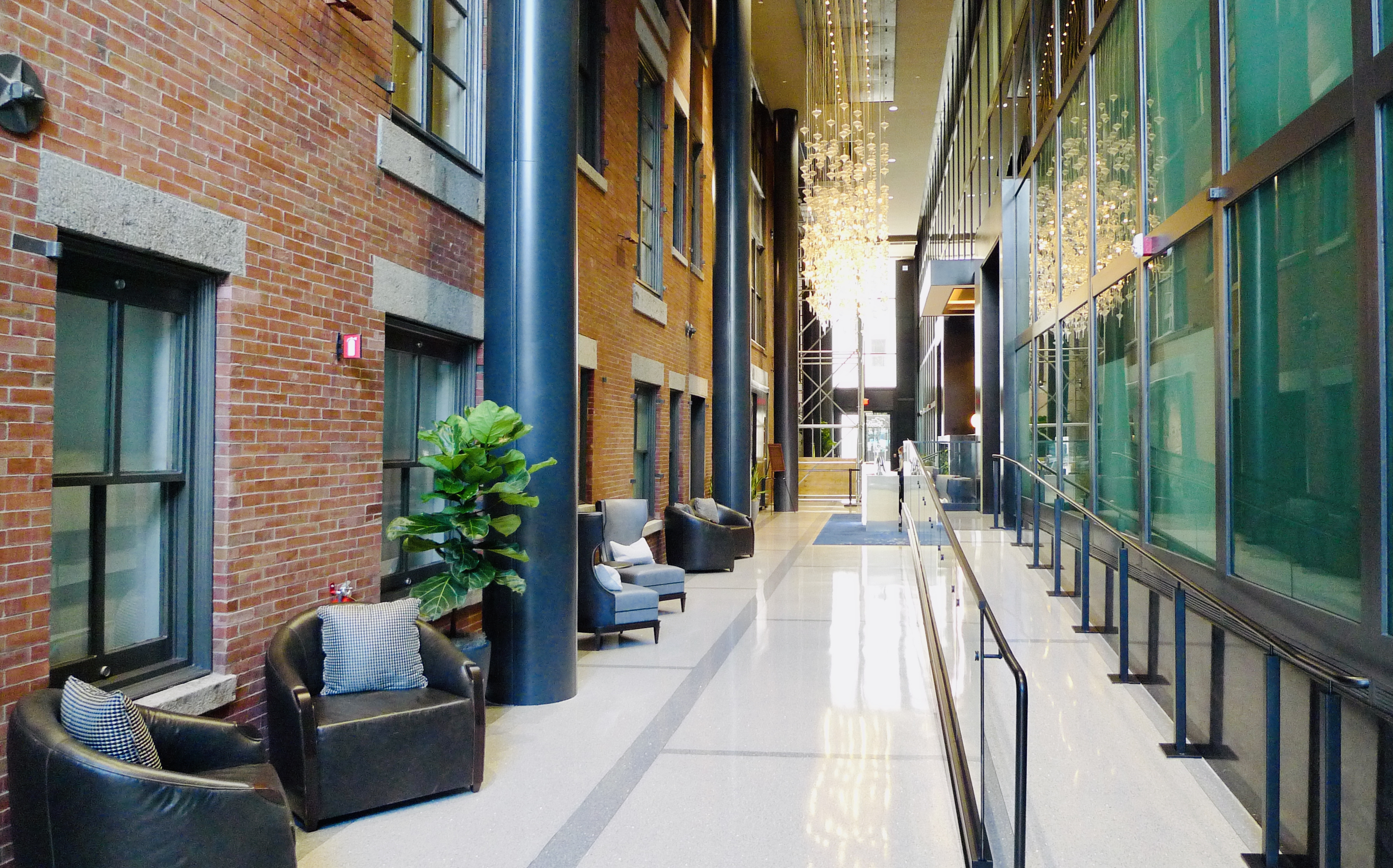 Having HOK’s building next door, however, meant that the Exchange Bank had been thoroughly analyzed and stabilized, so there were no major structural problems to hamper the insertion of the hotel in the 1888 bank. Project designer, Eric Zuena, of ZDS Architecture & Interior Design said this rehab was pretty straightforward. But Zuena ingeniously created the building’s signature feature of a three-story atrium, contrasting the brick hotel and glazed wall of the Fleet Center. What was once an alley between the two buildings is now a suave canyon linking Kennedy Plaza to Westminster Street. The entryway is both hip and traditional, something different from the ubiquitous and formulaic hotel lobbies foisted upon us by corporate culture.